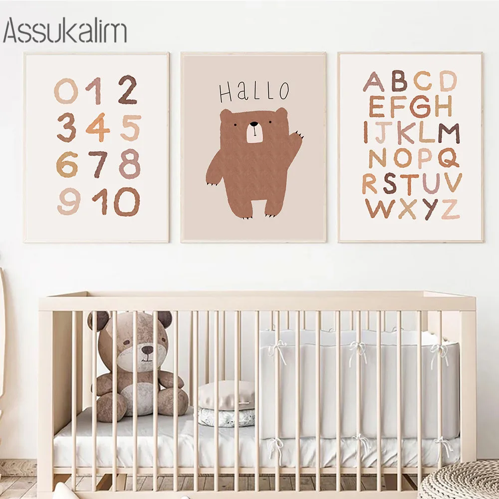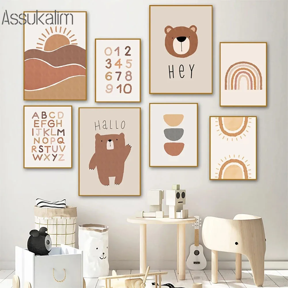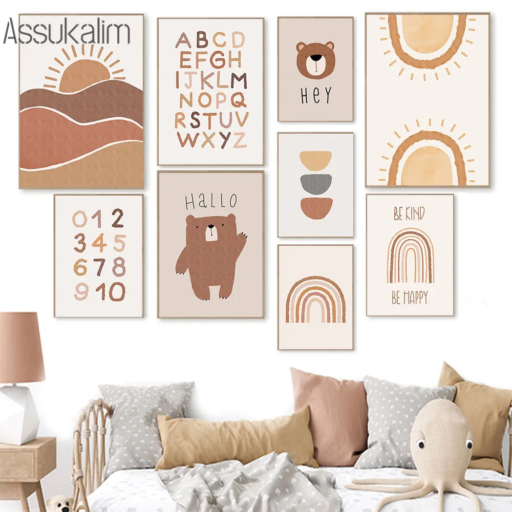 Картина на холсте Sunrise с изображением коричневого медведя, настенные принты, постер с алфавитом, богемное искусство, фрески питомника, художественная картина, декор для детской комнаты