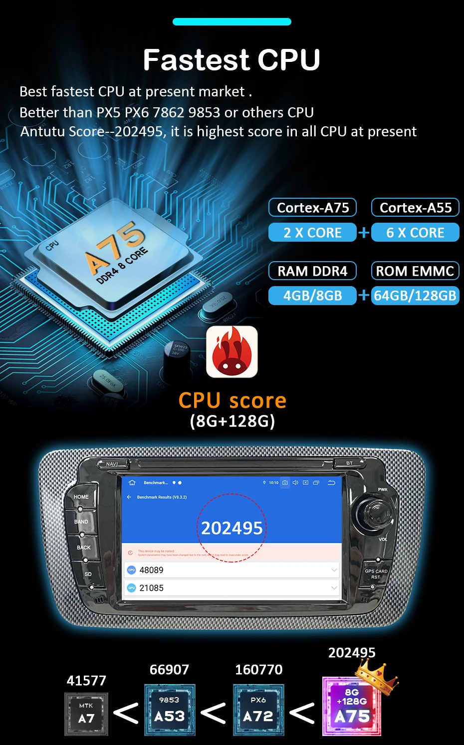 Самый быстрый процессорСамый быстрый процессор на современном рынке.Лучше, чем PX5 PX6 7862 9853 или другие ЦПAntutu Score- 202495, это самый высокий балл во всех ЦП в настоящее время