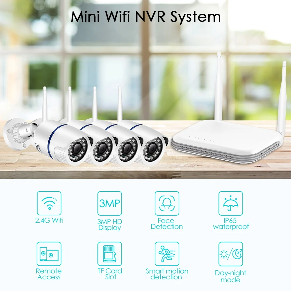 Содержимое упаковки 4 упаковок:4x WiFi камеры (3MP)1x Мини WiFi NVR(8CH)5x12V источники питания1 х 3 м сетевой кабель
