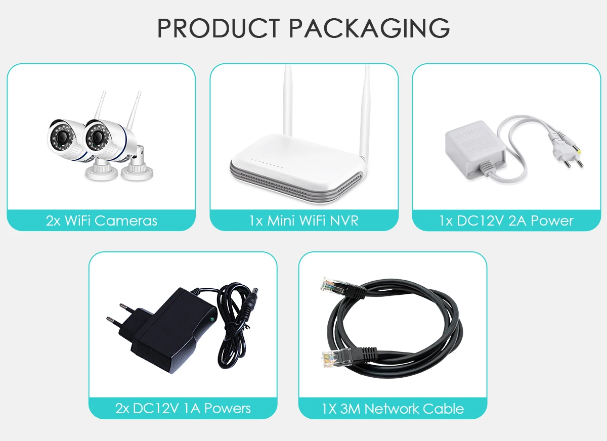 Содержимое упаковки 2 упаковок:2x WiFi камеры (3MP)1x Мини WiFi NVR(8CH)3x12V источники питания1 х 3 м сетевой кабель