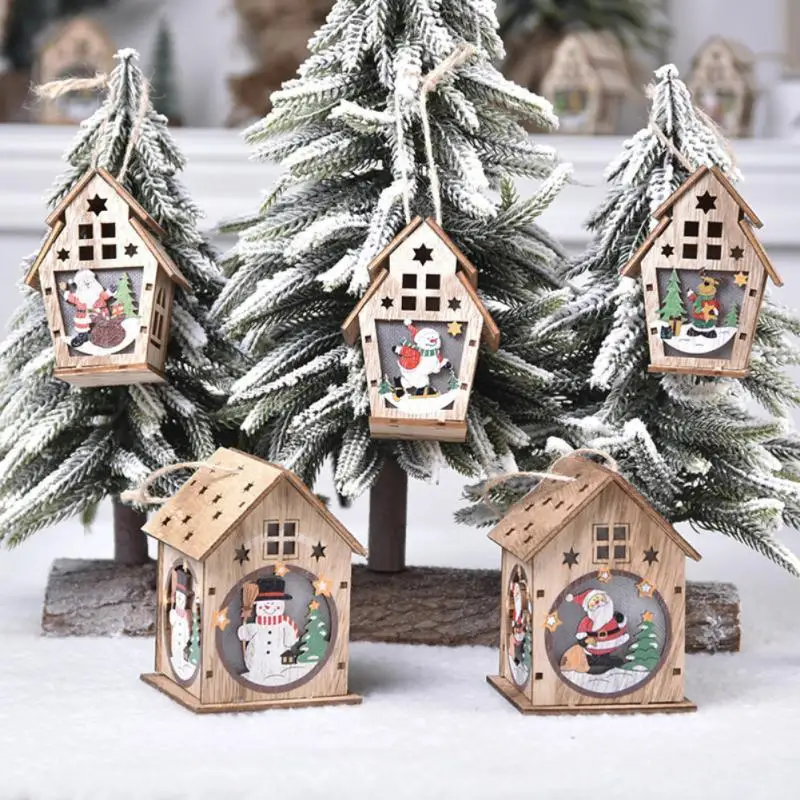 Рождественские светодиодные огни, деревянные дома, светящиеся рождественские украшения, домашние украшения, деревянные подвески для рождественской елки, украшения для окон