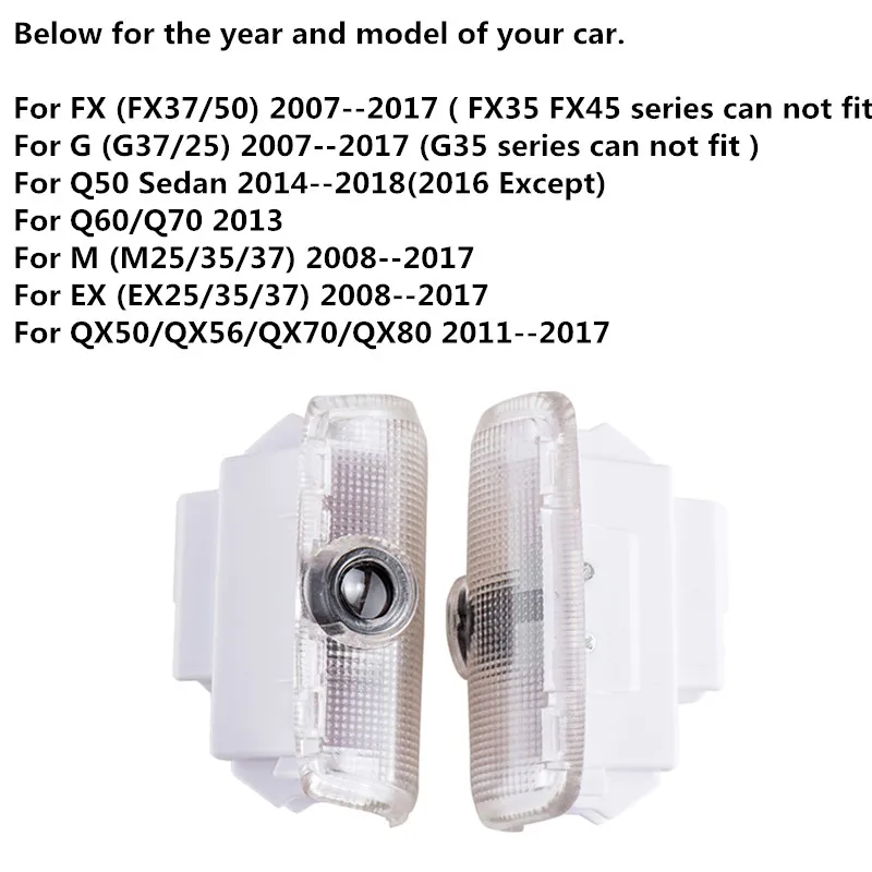 Характеристика:1. Простота установки-прямая замена. Никаких изменений не требуется. Без резки проволоки.2. Посылка включает в себя: 2 логотипа,Если в вашем автомобиле 4 оригинальных дверных светильника, пожалуйста, сделайте 2 заказа. Будет еще чудеснее.3. Прозрачный яркий лазерный светодиодный автомобильный светильник s с желанным логотипом эмблемы для-модный светильник и тени визуальный опыт для вас!Применение:Для FX (FX37/50) 2007-2017 (серия FX35 FX45 не подходит)Для G (G37/25) 2007-2017 (серия G35 не подходит)Для Q50 Sedan 2014 -- 2018 (за исключением 2016)Для Q60/Q70 2013Для M (M25/35/37) 2008 -- 2017Для EX (EX25/35/37) 2008 -- 2017Для QX50/QX56/QX70/QX80 2011 -- 2017Как заменить Автомобильный Дверной светильник:1. Используйте отвертку для снятия и отключения оригинальных ступенчатых огней двери;2. Подключите новые дверные огни с соответствующим разъемом;3. Поставьте новые дверные огни на место, где были ваши оригинальные огни;4. Сделано! Логотип должен быть проецирован на земле.Примечания:Если вы не можете подтвердить совместимость этих ламп с вашей моделью автомобиля или какие-либо проблемы с установкой, вы можете сначала связаться с нами!