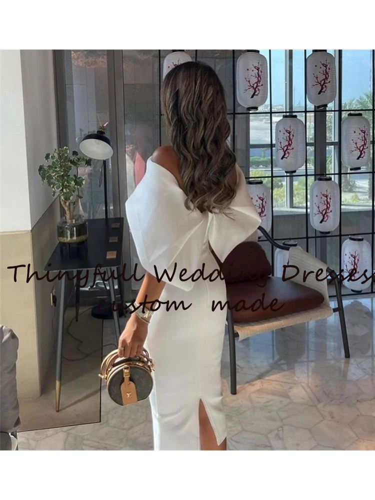 Платье свадебное короткое до середины икры, с открытыми плечами и бантом на спине