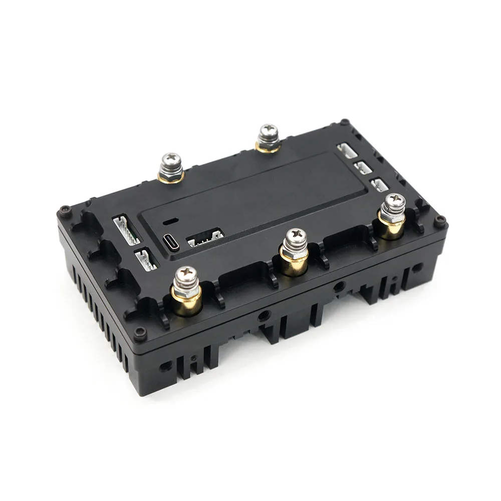 Оборудование:* Чехол для отвода тепла из алюминиевого сплава с ЧПУ, дополнительная система водяного охлаждения и система воздушного охлаждения.* Отдельный дизайн мощных и слабых токовых плат. Плата MOS с сильным током-6x3 унций, погруженная в золото, с прикрепленными 3 мм ² и 6 мм ² сечениями медных стержней для высокой токовой маршрутизации.* Схема слабого тока использует интерфейс USB-Type C, и через EMC оптимизацию, USB может хорошо общаться с ПК, даже когда цепь сильного тока ESC работает при высоком напряжении и высоком токе.* Фирменные интерфейсы внешнего источника питания 5 В и 12 В не вызовут помех при включении аналоговых схем, таких как закручивание/закручивание большого пальца.* Цепь сильного тока использует 24 шт FDBL0200N100 N-MOS. Теоретический мгновенный выдерживающий ток близок к 1200А! Помимо оригинального VESC 75V 300A!* Используйте независимый драйвер TI UCC27211. Драйвер ток составляет 2,5 раз выше, чем у DRV8301/8302, и драйвер скорости в 3 раза быстрее. Он может осуществить nanosecond включение трубки MOS и улучшить эффект работы двигателя при высоком ERPM. Максимальная погрешность может достигать 140 000.* 12 шт. 100V 470 мкФ высокочастотное низкое сопротивление конденсаторов. Мощность намного превышает другие коммерческие VESCs на рынке.* Высокотоковая конструкция соединения холодного прессования делает соединение более стабильным и менее теплогенерирующим.* Встроенный 3,3 V/5V переключаемый источника питания для зала/энкодер. Напряжение источника питания может быть изменено, чтобы адаптироваться к вашему холлу/кодовой плате.