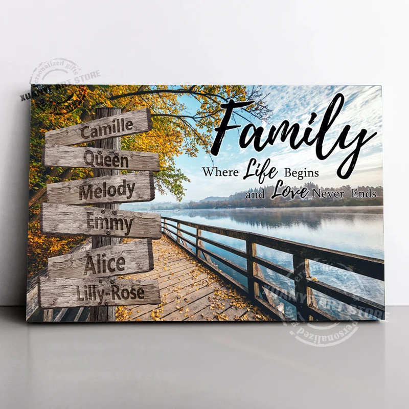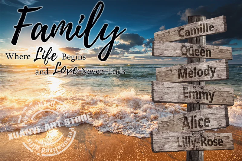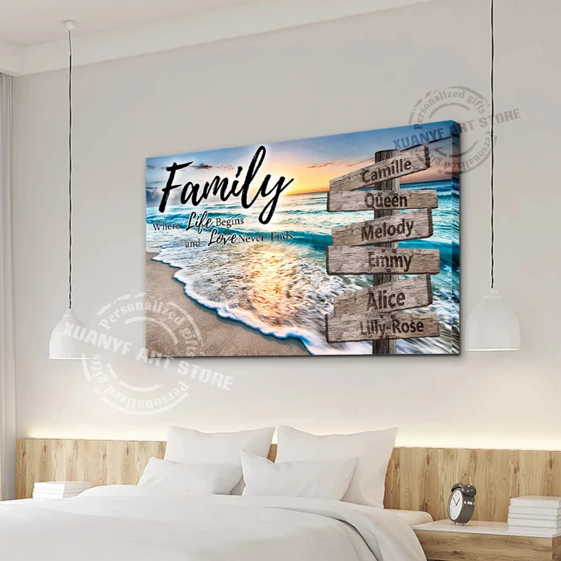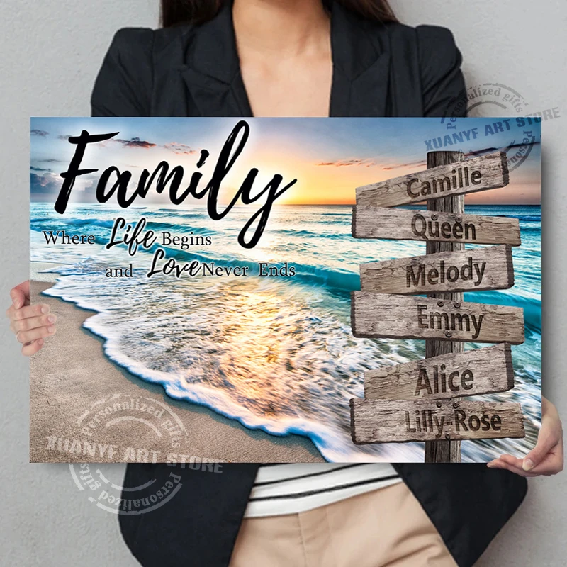 Персонализированный закат пляж семья, где жизнь, любовь никогда не заканчивается, вдохновляющие цитаты, холст, настенное искусство, знак имени, картина на заказ