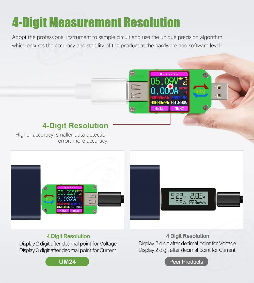 USB-вольтметр-Амперметр RIDEN UM24UM24C Type-C, измеритель сопротивления, тестер заряда напряжения и тока, тестер с цветным ЖК-дисплеем 2.0