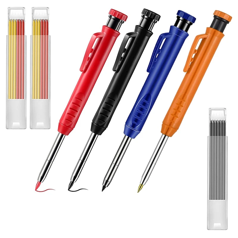 4 механических карандаша, содержащий черный и желтый, красный, свинец, достаточно для удовлетворения ваших повседневных потребностей, вы также можете поделиться с друзьямиИзысканный дизайн: Эти прочные деревообрабатывающие карандаши разработаны с металлическими и резиновыми материалами, которые могут предоставить вам удобный и нескользящий опыт письма. Высококачественный чехол для ручки защитит ваш стержень ручки от поломкиРазумный Дизайн: наш механический карандаш удобен в использовании. Его конструкция подходит для формы руки, благодаря большему диаметру, чтобы улучшить сцепление. Таким образом, деревообрабатывающий карандаш не выскальзывает из пальцев, а повторяющиеся отметины уменьшат больПодходит для: Эта ручка-карандаш для деревообработки является прочной, точной и практичной. Из-за красного цвета его можно найти в любом месте. Даже в середине строительной площадки. Кроме того, его тонкие точки длиной 6 мм и 43 мм позволяют ему рисовать в местах, где другие масляные ручки не могут идти.Используется для любых вещей, где угодно: Поместите этот промышленный карандаш в ваш набор измерительных инструментов, Повесьте его в ремень инструмента для быстрого и легкого доступа или храните его в ручном ящике для деревообработки. Удобный карандаш универсален и прост в использованииНесколько функций: на крышке механического карандаша есть точилка для карандашей, вы можете легко затачивать сердечник ручки, когда его нелегко написать. Советы: Пожалуйста, аккуратно Замените карандаш, чтобы предотвратить повреждениеХороший инструмент для письма: черные и желтые стержни для карандаша, удобные для повседневного использования, помогут вам более эффективно выполнять письма и рисованияЦвет: красный + желтый + синий + оранжевыйМатериал: АБС + металлПосылка:4 x деревообрабатывающие карандаши (1 красный/1 черный/1 синий/1 оранжевый)3 коробки x заправки (6 желтый/6 Красный/6 черный)