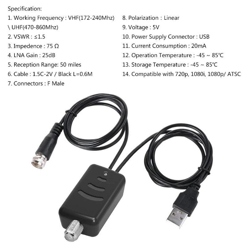 2021 Новый 25дб LNA усиление усилитель тв антенны HD ТВ усилитель сигнала цифровой VHF UHF усилители с линейной поляризациейOOTDTYОсобенности на 100% абсолютно новый и высокого качестваОн имеет высокий коэффициент усиления и низкую частоту ошибок для приема цифрового ТВ сигнала и имеет значительное усиление сигнала при фактическом использовании. Увеличьте прием ТВ-шоу и устраните паузы на изображениях.С совместимой телевизионной антенной с высоким коэффициентом усиления, вы можете наслаждаться всеми новостями, sitcoms, детьми и спортом бесплатно.Максимальный Прием: усилитель может улучшить сигнал о том, что препятствие между телевизионной антенной и местной вещательной башней ослаблено, а диапазон полученного сигнала может достигать 50 миль.С уникальным пластиковый чехол во всей сети, вы можете наслаждаться любимой ТВ показывает на гроза день, не беспокоясь о грозы.Компактный и легкий: он не занимает много места и идеально подходит для смешивания с окружающей средой.Спецификация: Материал: АБС-пластикРабочая частота: VHF(172-240 МГц) UHF(470-860 МГц)КСВ: ≤ 1,5Импиденция: 75 ΩКоэффициент усиления LNA: 25 дБДиапазон приема: 50 мильКабель: 1.5C-2В/черный L = 0,6 мРазъемы: F папаПоляризация: ЛинейныйНапряжение: 5 ВРазъем питания: USBПотребление тока: 20 мАРабочая температура: -45 ~ 85 ℃Температура хранения: -45 ~ 85 ℃Совместим с 720p, 1080i, 1080p/ ATSCПосылка включает в себя: 1 усилитель сигнала HDTVПримечание: допускается погрешность в 1-2 см из-за ручного измерения, убедитесь, что вы не возражаете перед заказом.Из-за разницы между различными мониторами изображение может не отражать фактический цвет изделия.