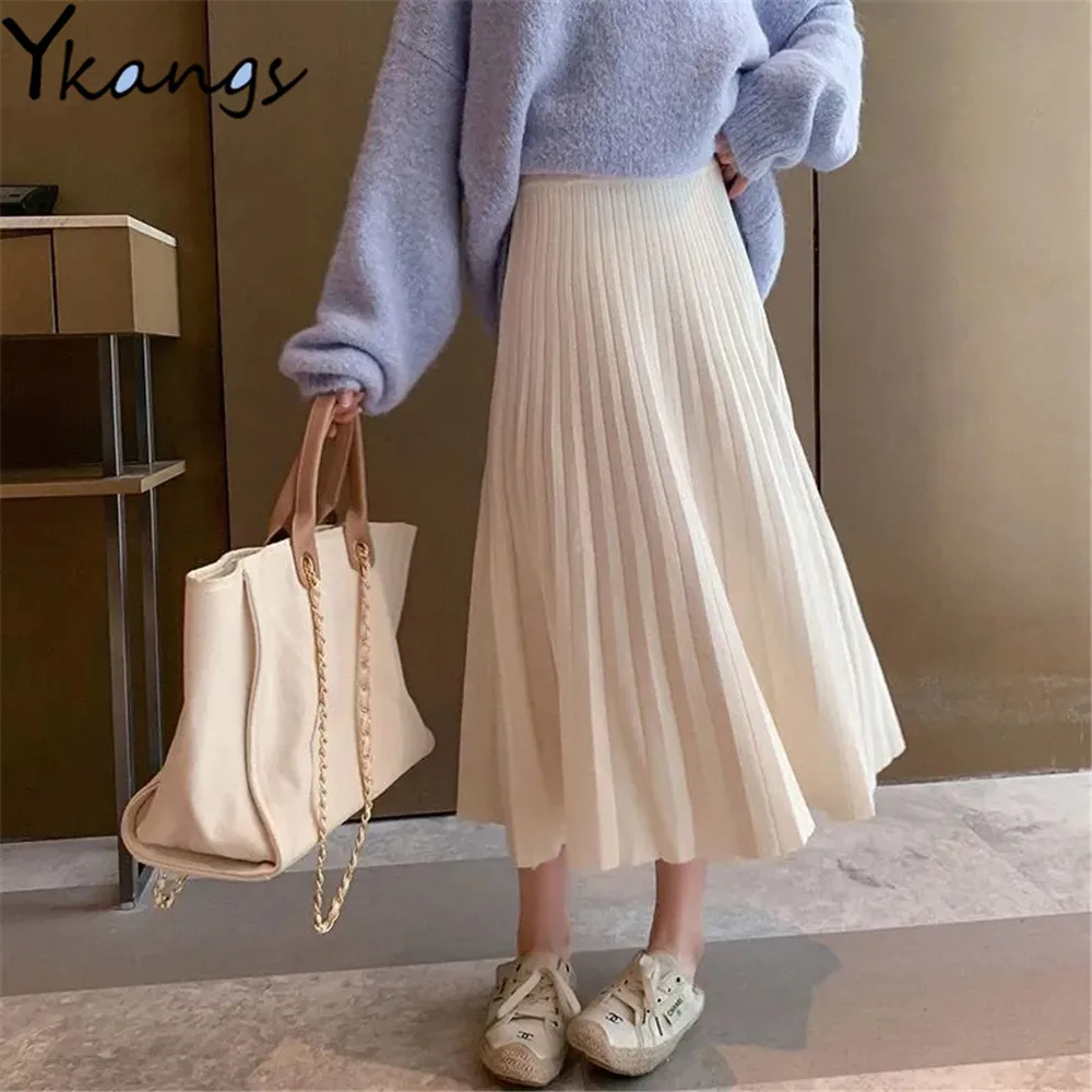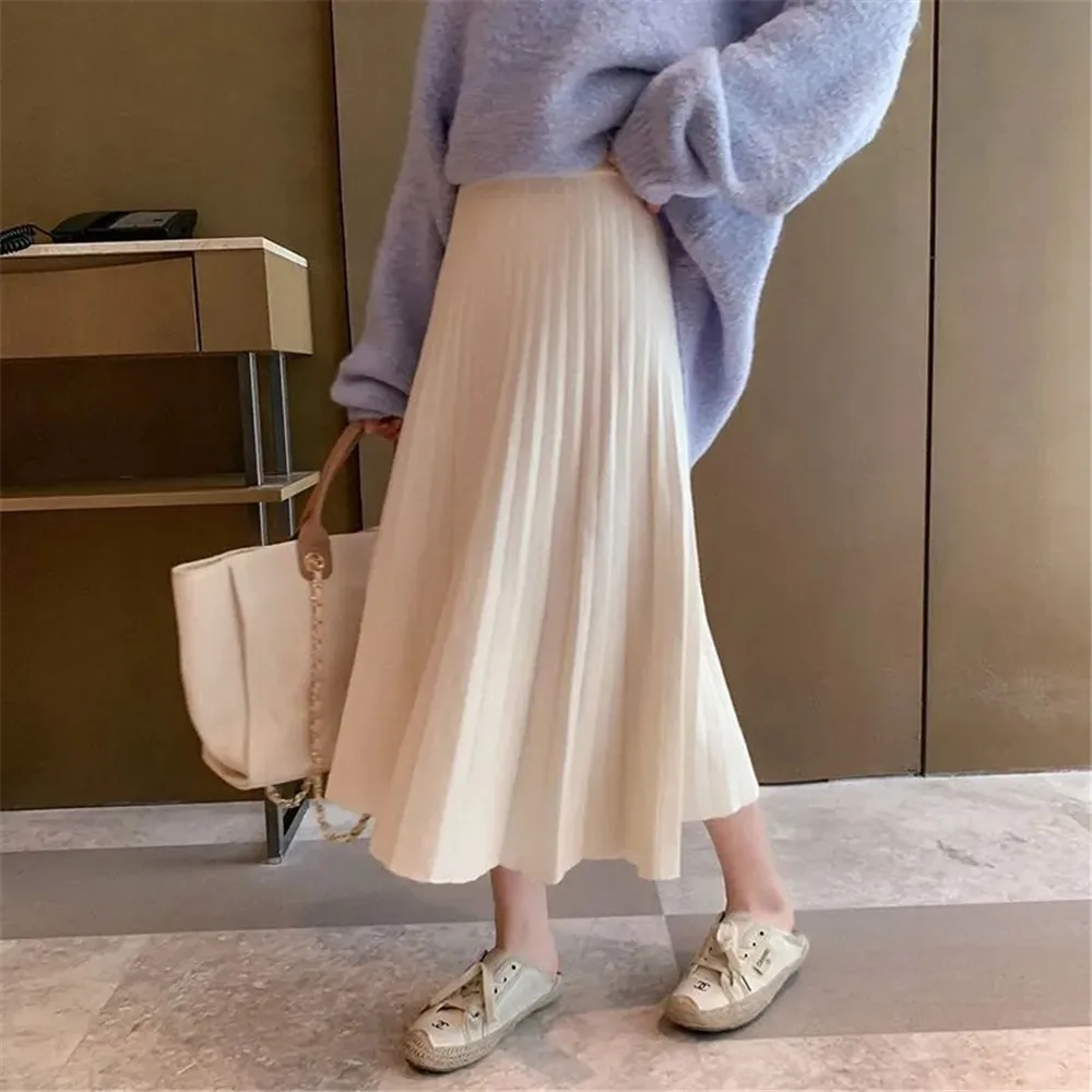 Утолщенная теплая вязаная женская юбка А-силуэта, черная бежевая, новинка 2021, однотонная офисная осенне-зимняя длинная юбка с высокой талией и зонтиком для женщин