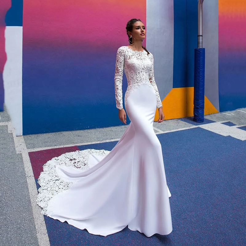 Роскошное Свадебное платье с длинным рукавом, иллюзионные свадебные платья, атласное кружевное платье до пола с юбкой-годе и шлейфом, свадебное платье
