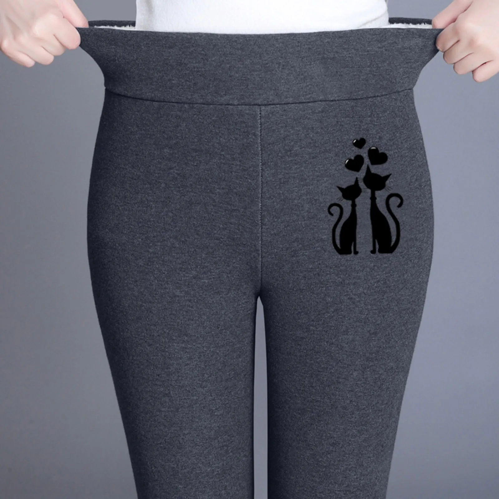 Зимние леггинсы с высокой талией, женские теплые брюки, леггинсы с принтом кошек, эластичные удобные теплые леггинсы из флиса