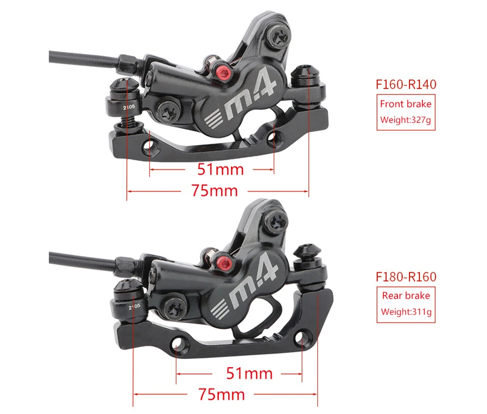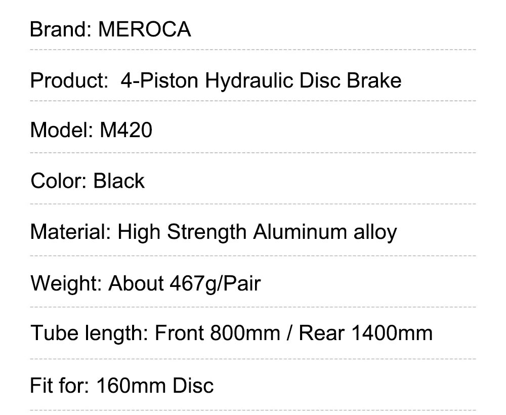 -Изделие: MTB велосипед гидравлические дисковые тормоза 4 Высокое качество поршневой палец стоп-сигнал-Материал: алюминиевый сплав-Цвет: черный-Модель: MT420-Поршень: 4 поршня-Использование для: системы горного велосипеда-Длина левого заднего тормоза: 140 мм-Правая длина переднего тормоза: 800 мм-Диск: 160 мм-Размер: пожалуйста, обратитесь к фото ниже-Вес: около 647 г/пара