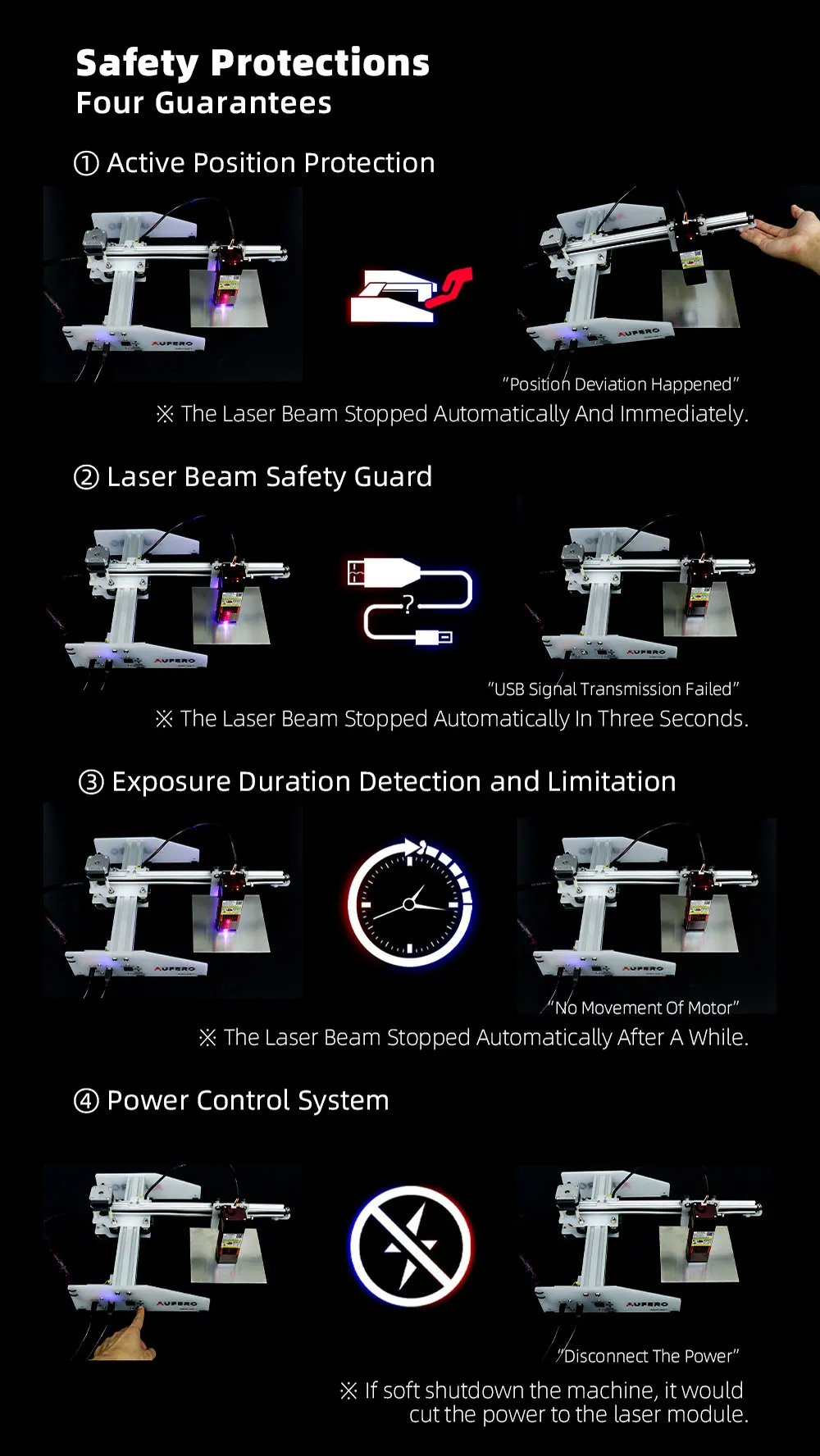 [Общая Оптимизация] Aufero имеет более длительный срок службы, потому что механическая структура была оптимизирована и разработана для высокой точности гравировки в течение длительного времени. В то же время, Aufero может предоставить пользователям больше безопасности, потому что он имеет больше функций безопасности.