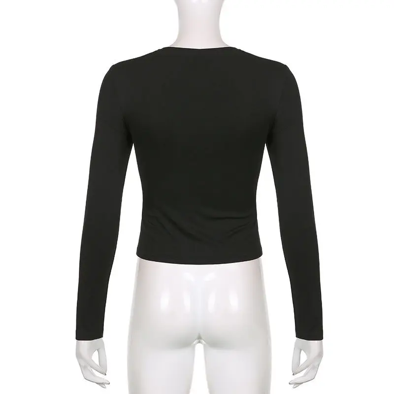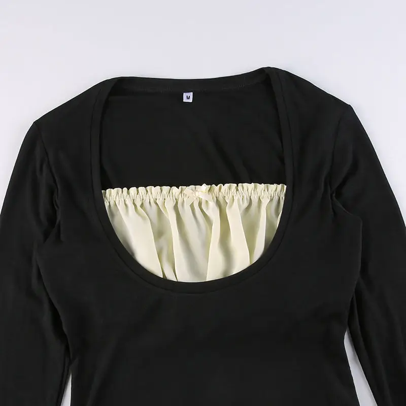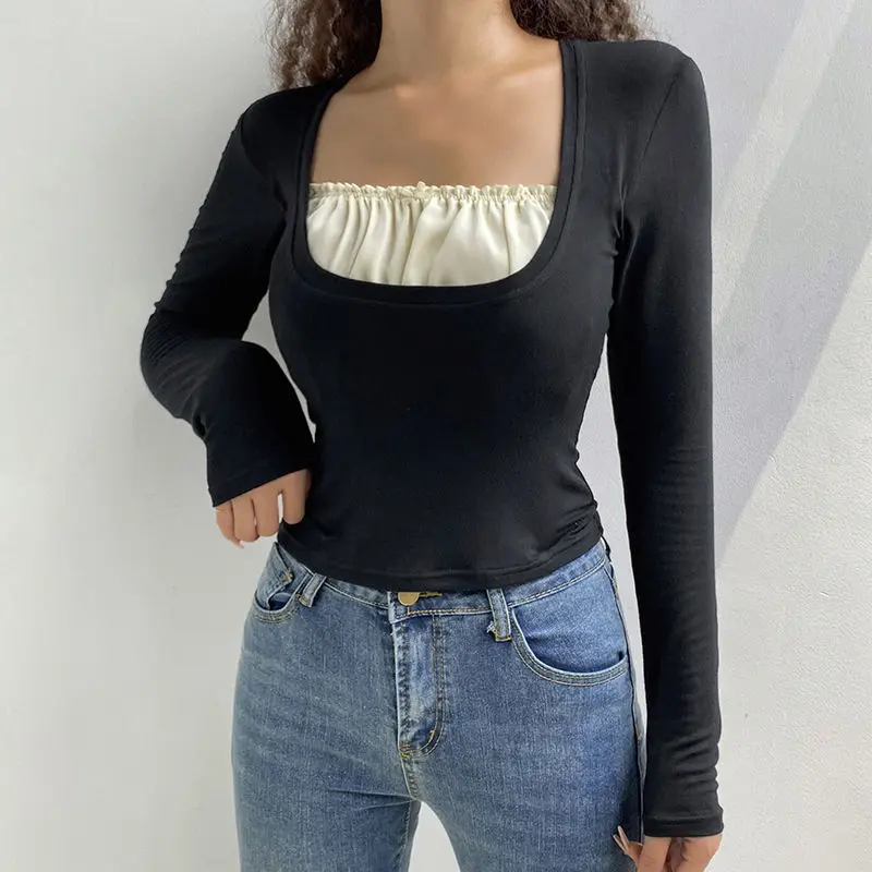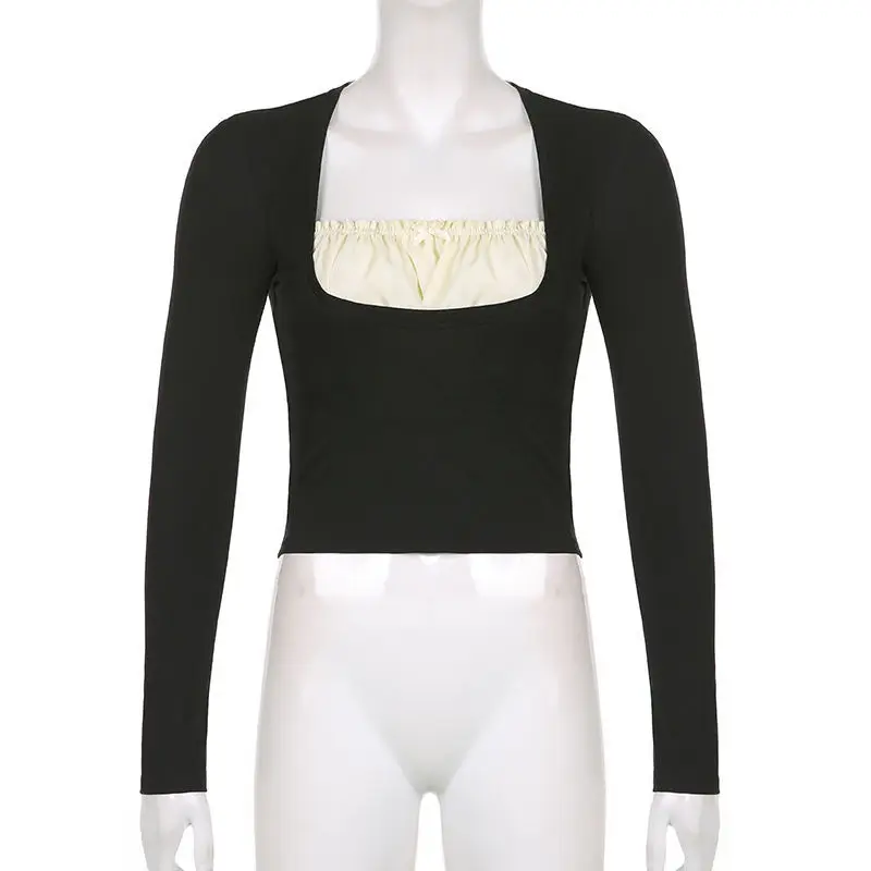 Женский топ с квадратным вырезом, черная футболка с длинным рукавом...