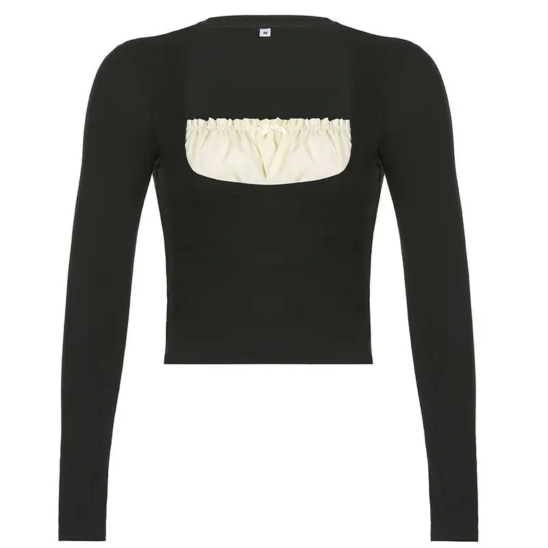 Biggorange винтажные Лоскутные тонкие Топы Y2k, топы с длинным рукавом и квадратным вырезом, ретро повседневные футболки, эстетичный корейский шикарный укороченный топ