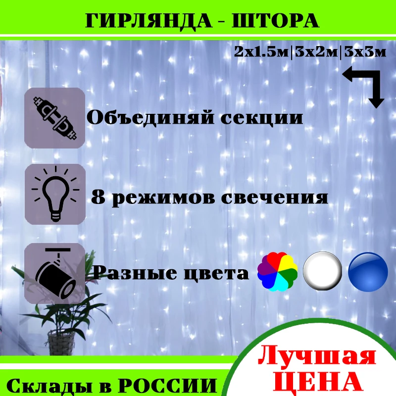Новогодняя гирлянда 3х2 метра на окно светодиодная Гирлянда штора 2 х 1.5 метра Гирлянда дождик 3 х 3 метра Шторка диодная