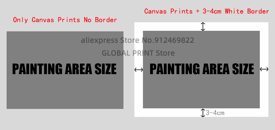 · Без рамки (только холст).По умолчанию плакат будет иметь дополнительный белый край 3 см для вас, чтобы поместиться в рамку.Например: если вы заказываете 50x70 см, вы получите (50 + 6)X(70 + 6) см. Дополнительно 3 см с каждой стороны