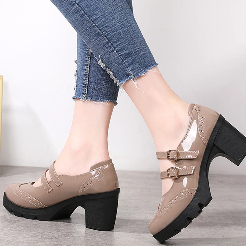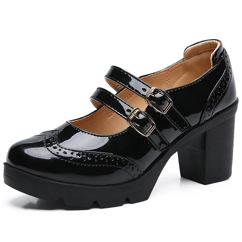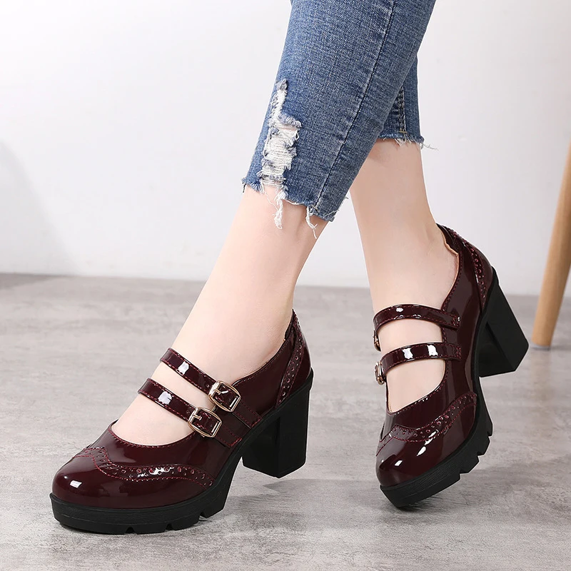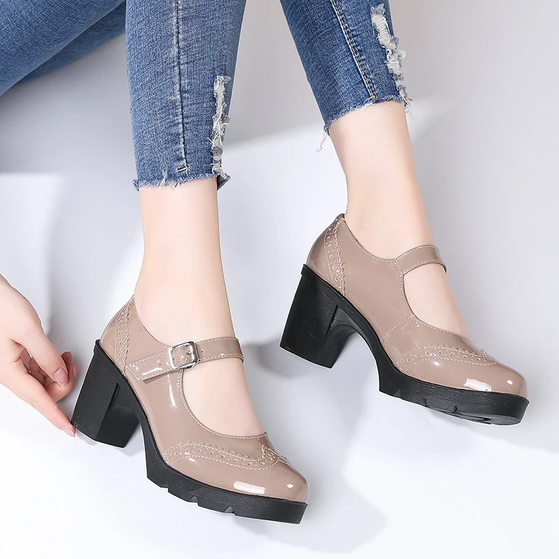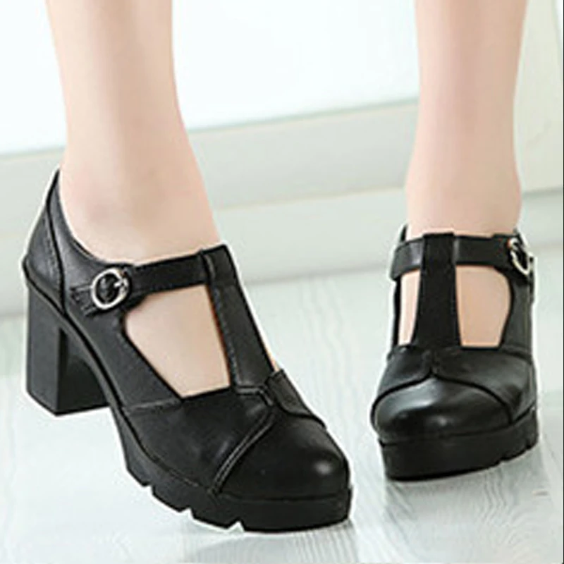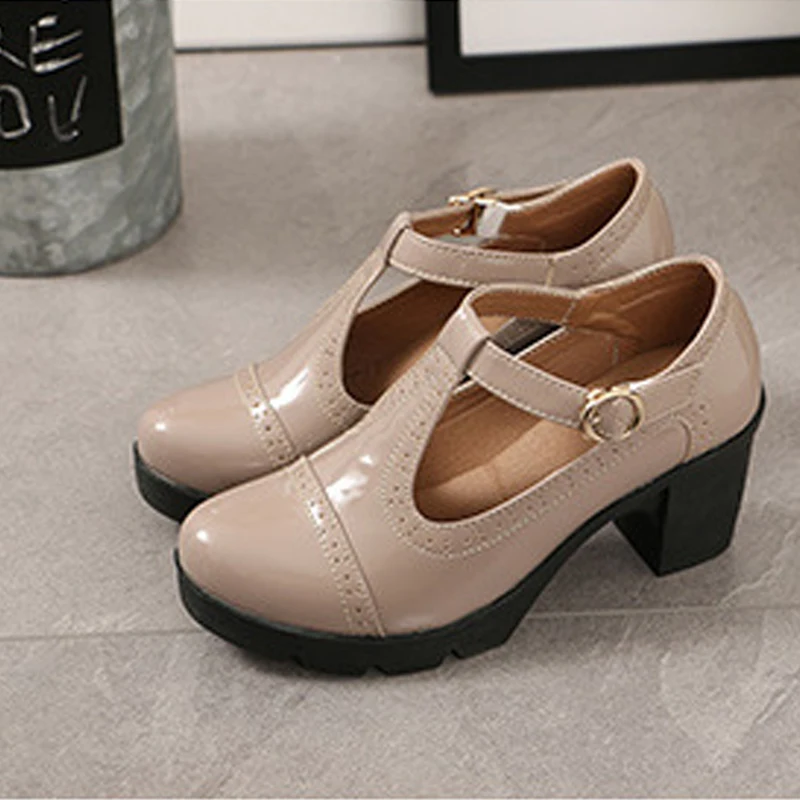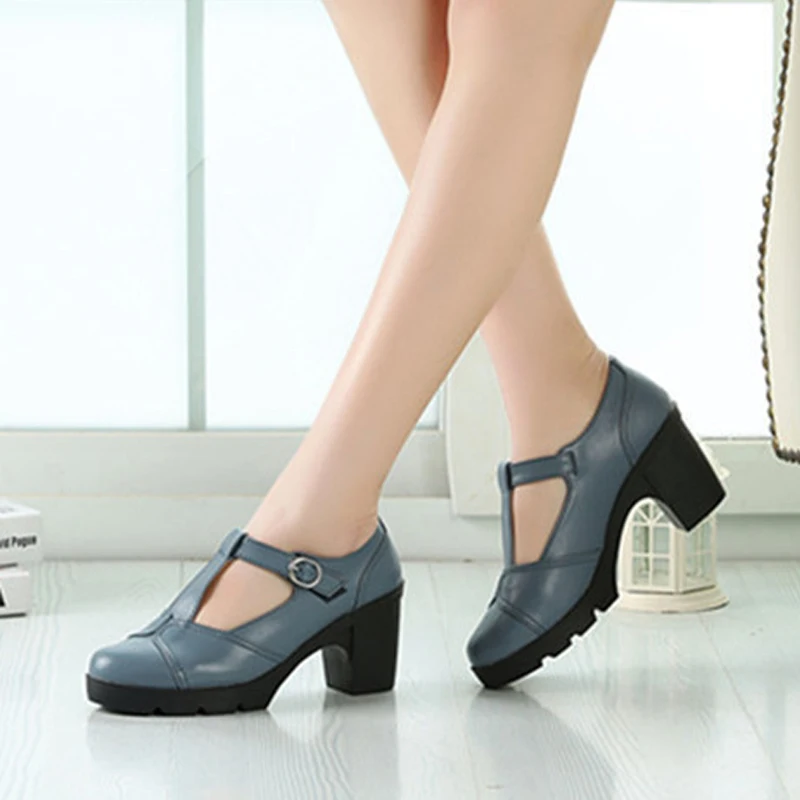 Туфли-лодочки на высоком каблуке с Т-образной пряжкой, женские туфли на толстой подошве в стиле ретро, кожаные туфли на высоком каблуке для офивечерние, банкета
