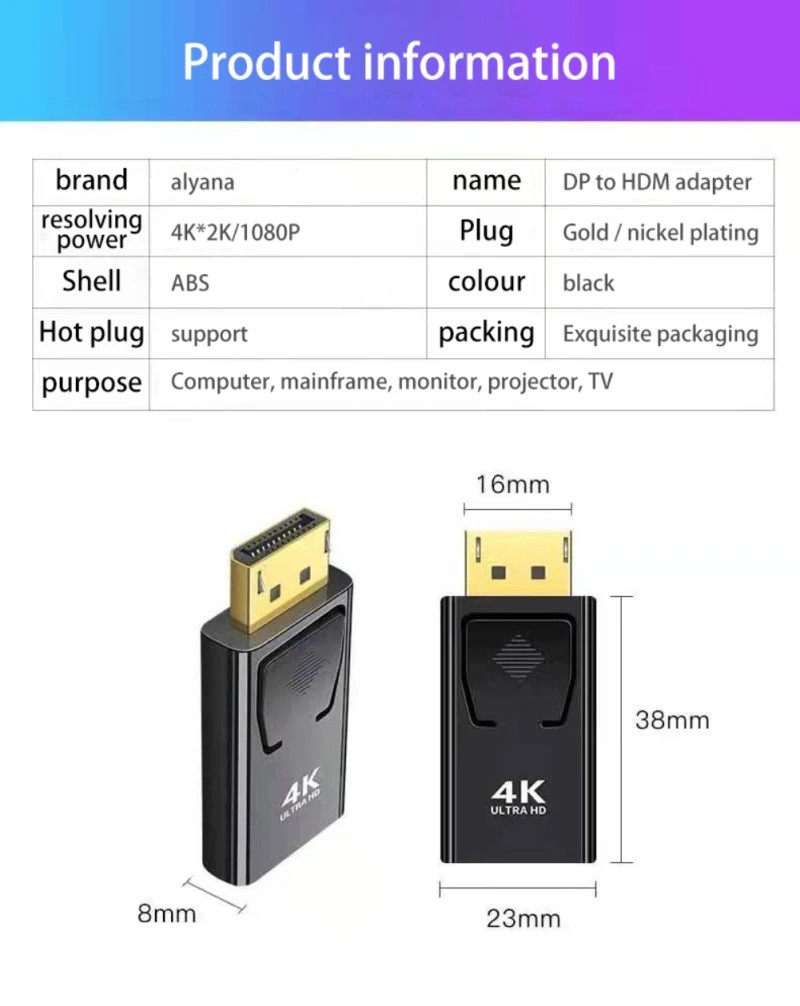 1. Это DP (порт дисплея) к HDMI-совместимому (4K/1080P) адаптеру, используется для настольного ПК/ноутбука DP к HDTV, монитору ....