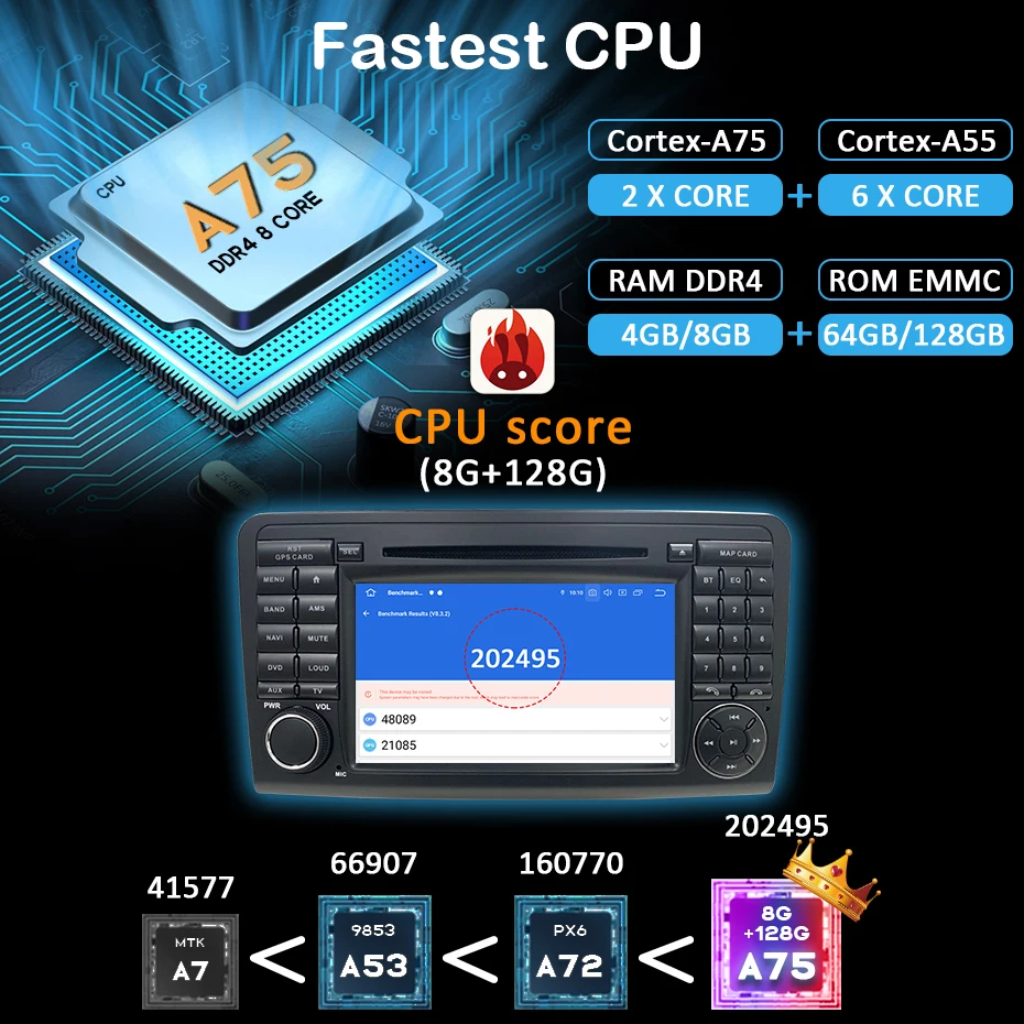 Самый быстрый процессорСамый быстрый процессор на современном рынке.Лучше, чем PX5 PX6 7862 9853 или другие ЦПAntutu Score- 202495, это самый высокий балл во всех ЦП в настоящее время