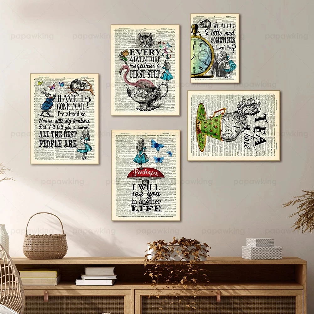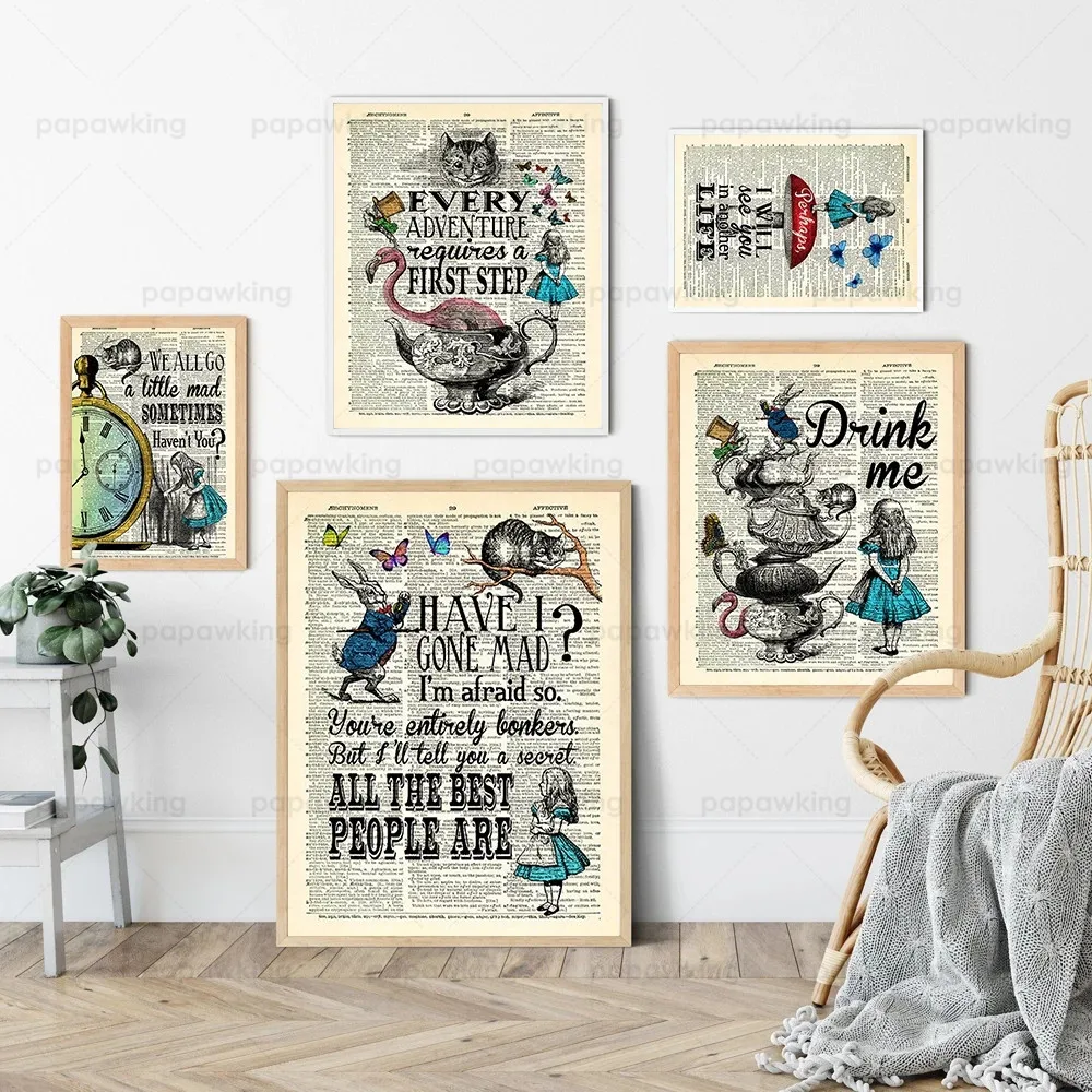 Настенный постер с изображением сказочных сказок, кролика, животных, ведьмы, словарь, искусство, страны чудес, цитаты, Картина на холсте для вечеринки, декор для детской комнаты, постер
