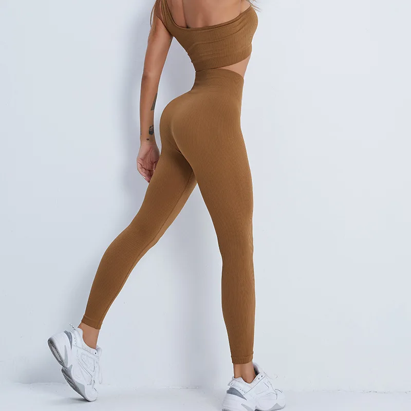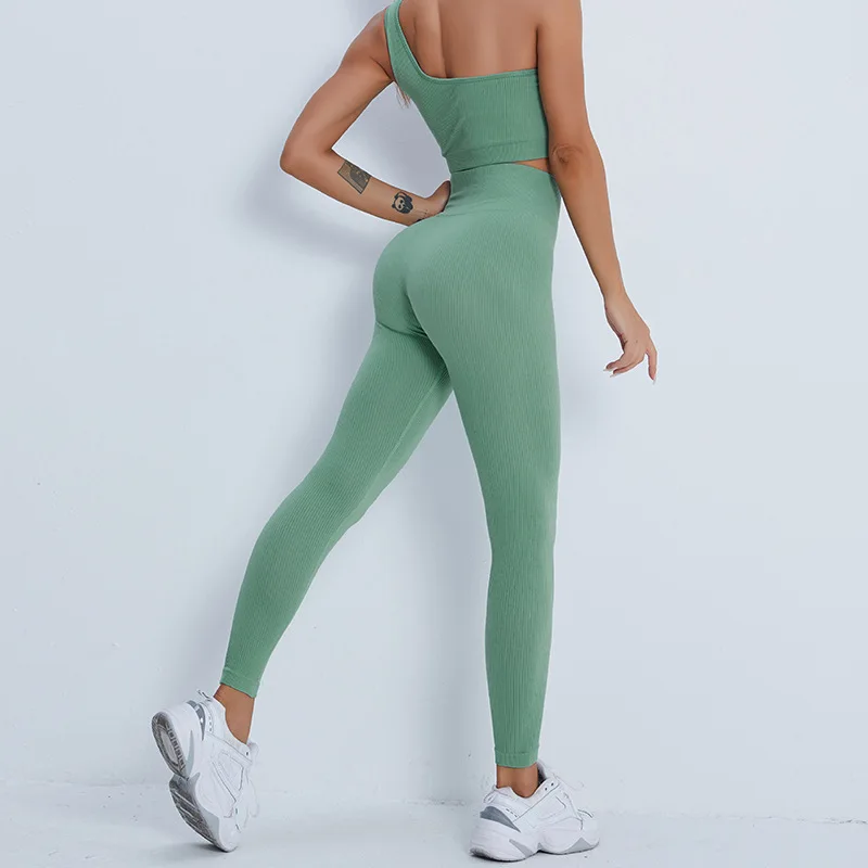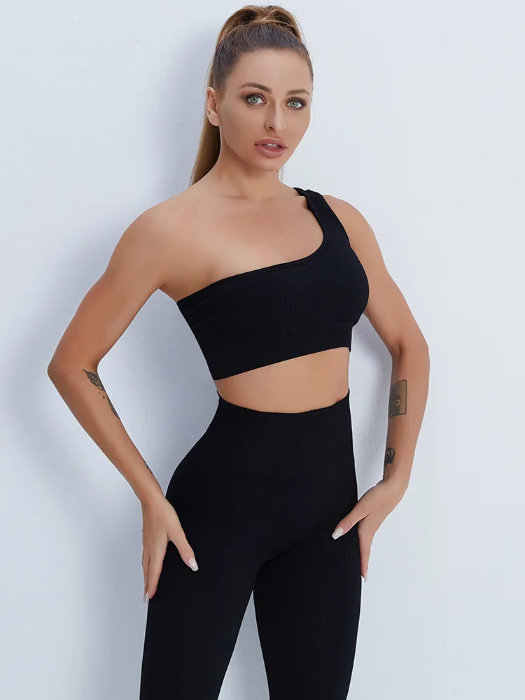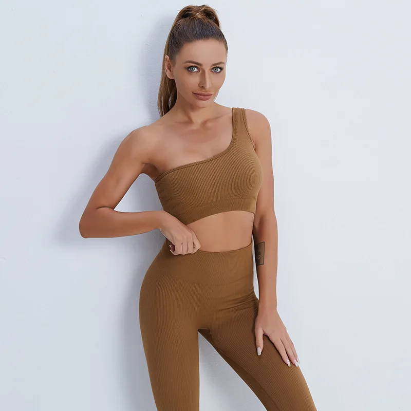 Женская одежда 2021, однотонный спортивный бюстгальтер на одно плечо, бесшовные леггинсы, брюки в рубчик, комплект из двух предметов, спортивные костюмы, одежда для фитнеса