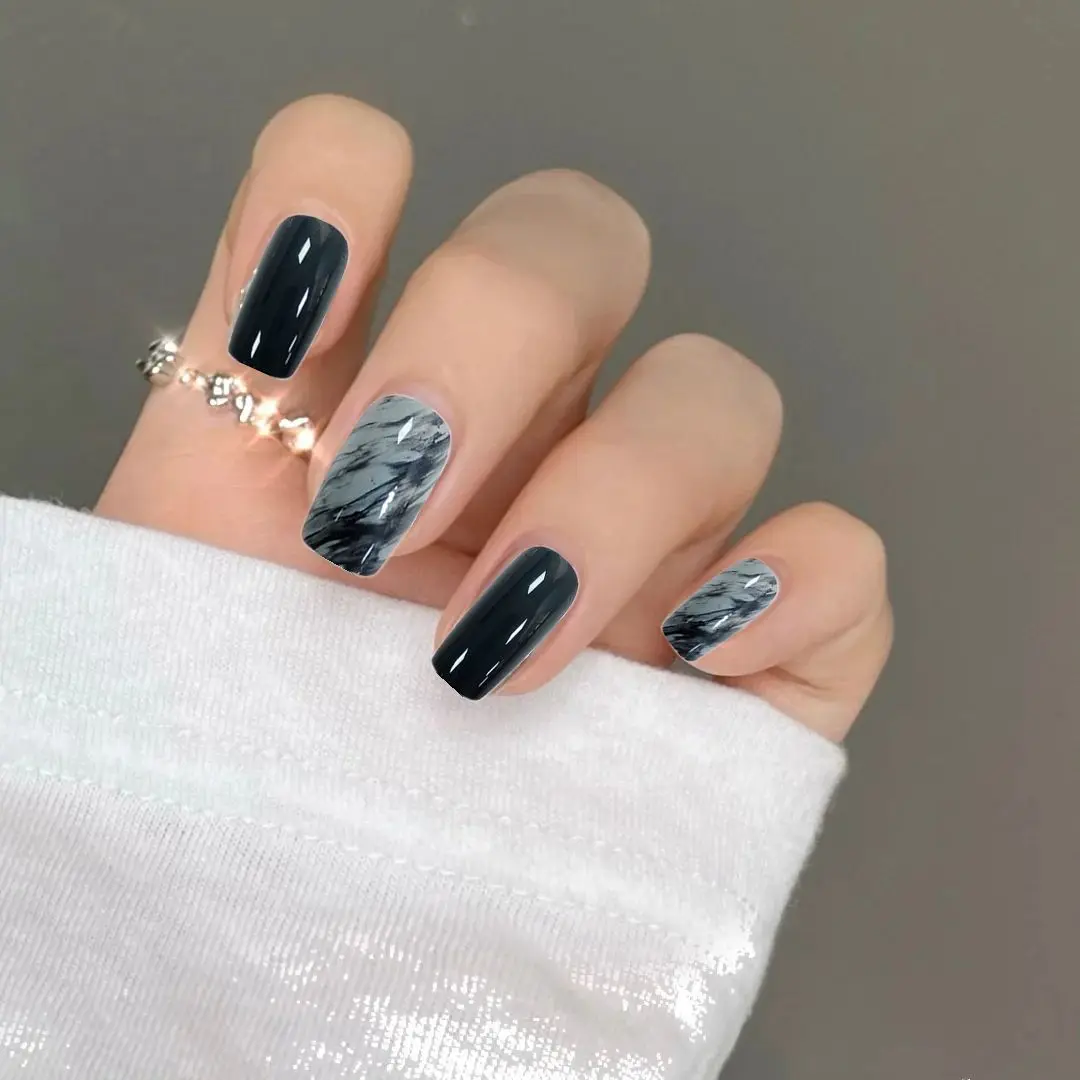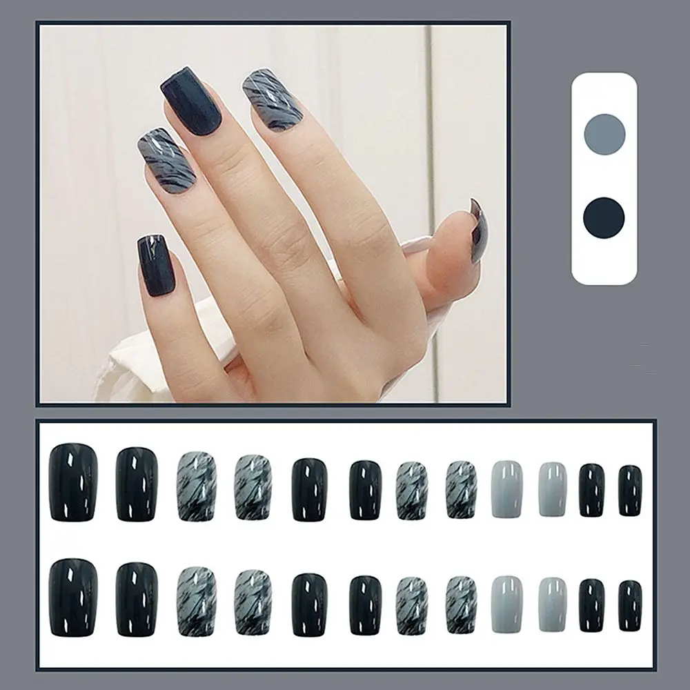 Накладные ногти с длинной квадратной головкой синие и серые наклейк...