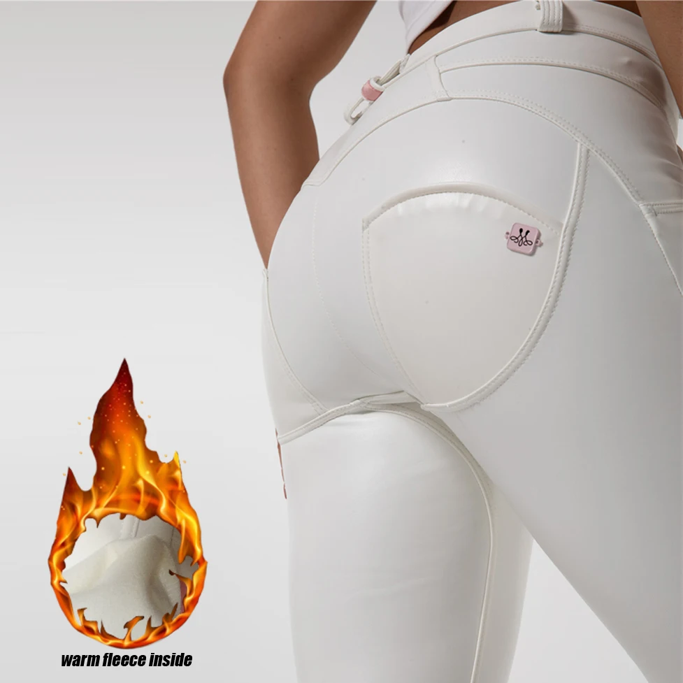 Кожаные леггинсы Melody с обычной талией и высокой талией, растягивающаяся ткань с четырьмя способами, очень мягкие и удобные, вы можете назвать их белыми кожаными брюками для женщин, женские брюки из искусственной кожи, флисовые Леггинсы для бега на подкладке