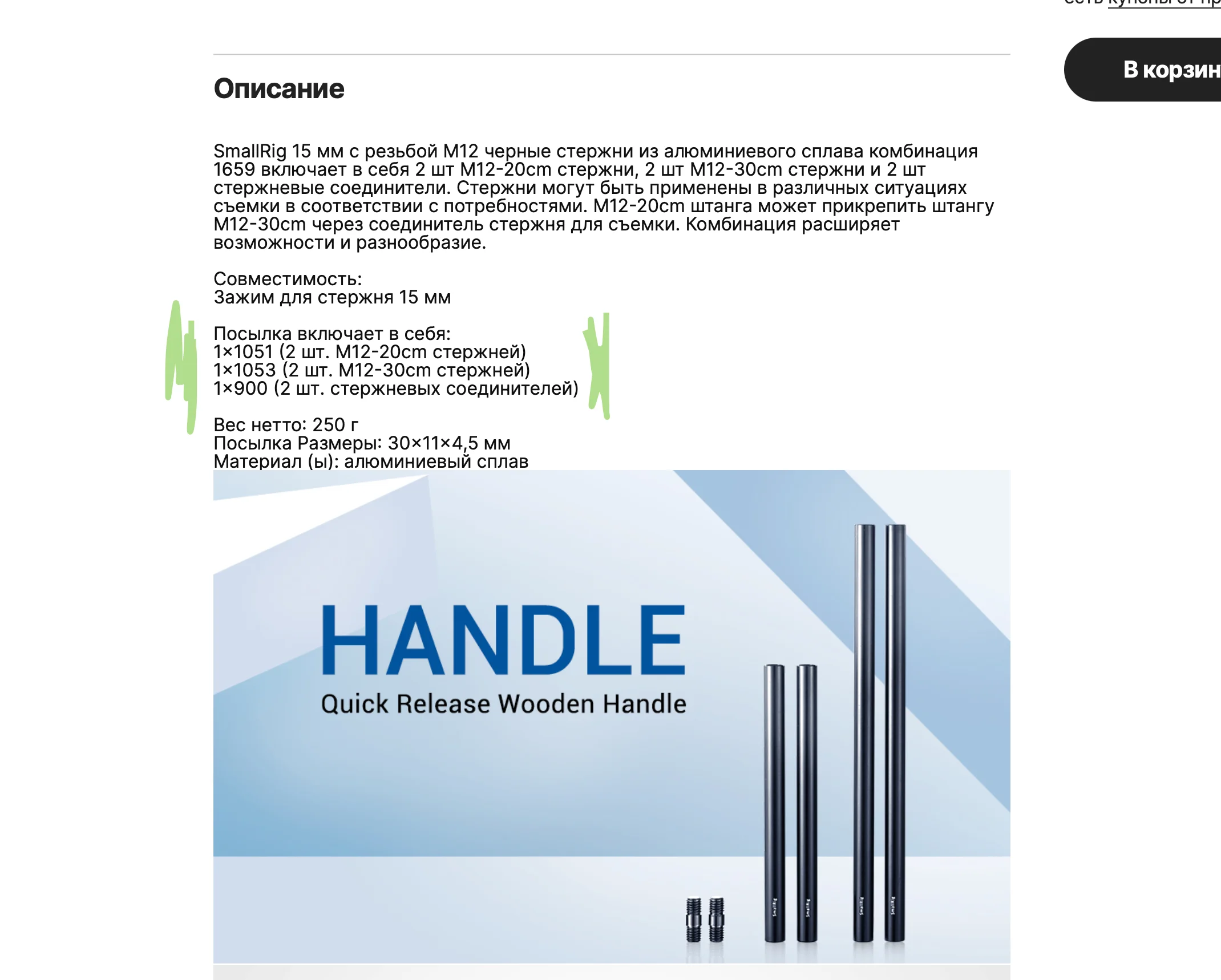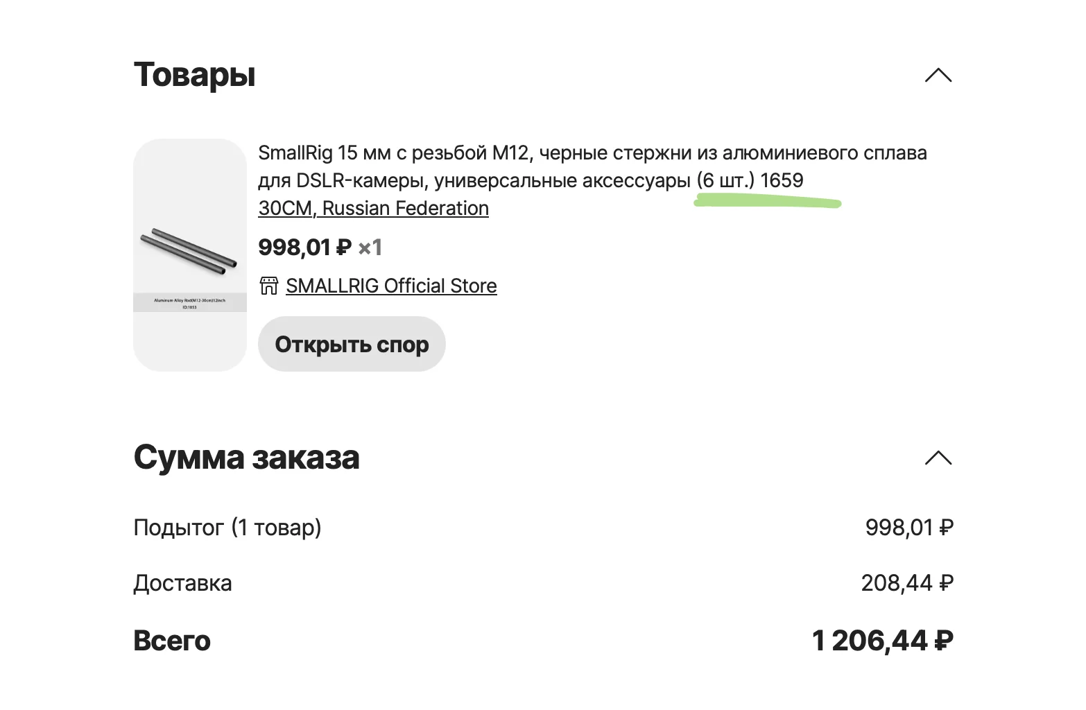 В описании заказа есть информация о том, что в него входит "6 шт."! Так же в описании внизу страницы с товаром написано: " Посылка включает в себя: 1x1051 (2 шт. M12-20cm стержней) 1x1053 (2 шт. M12-30cm стержней) 1x900 (2 шт. стержневых соединителей) Вес нетто: 250 г Посылка Размеры: 30x11x4,5 мм Материал (ы): алюминиевый сплав " По факту я получил только 2 шт. "M12-30cm стержни"! Связался с магазином. И в ответ получил - типа всё нормально. Мы вам отправили то, что вы заказывали. А я заказывал товар согласно его описания, где уточняется про 6 штук! Считаю, что меня обманули!
