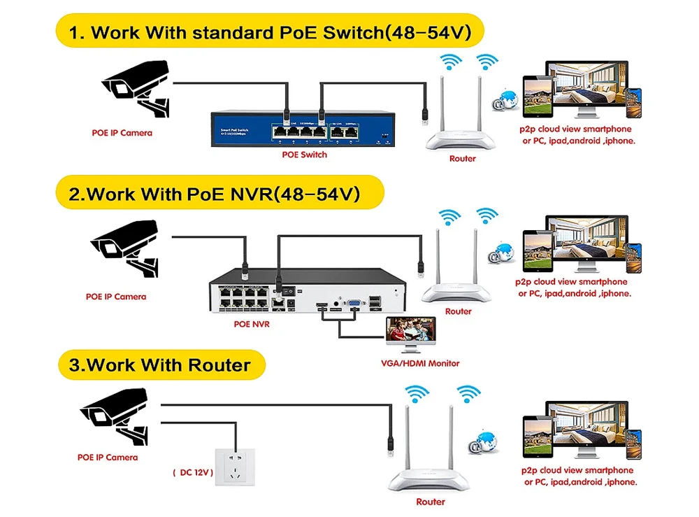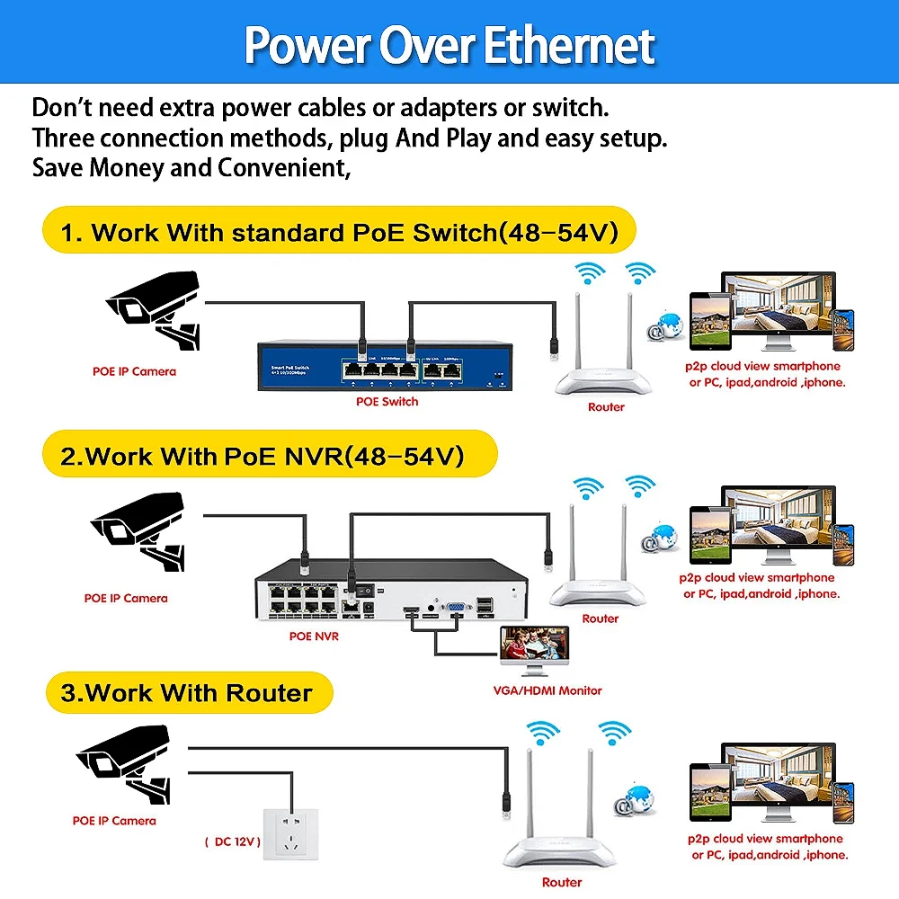 Нет дополнительных кабелей питания или адаптеров, просто подключив ip-камеру к NVR с помощью одного кабеля, вы можете легко завершить установку без знания о компьютере или сети и начать наслаждаться супер простым мониторингом среди вашего смартфона, планшета или ПК.Экономьте деньги и удобный POE NVR = NVR + POE коммутатор, подключи и работай и простая настройка!