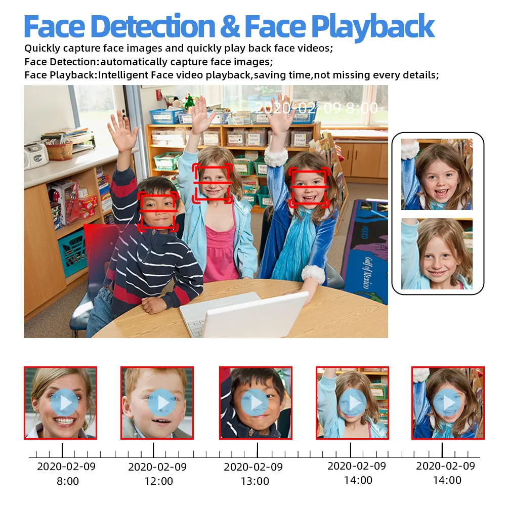 Обнаружение лица, воспроизведение лица и запись лица; Быстрое снятие изображений лица и быстрое воспроизведение видео лица; Распознавание лица: автоматическое снятие изображений лица; Интеллектуальное воспроизведение лица: интеллектуальное воспроизведение видео лица, экономия времени, не пропустите все детали.