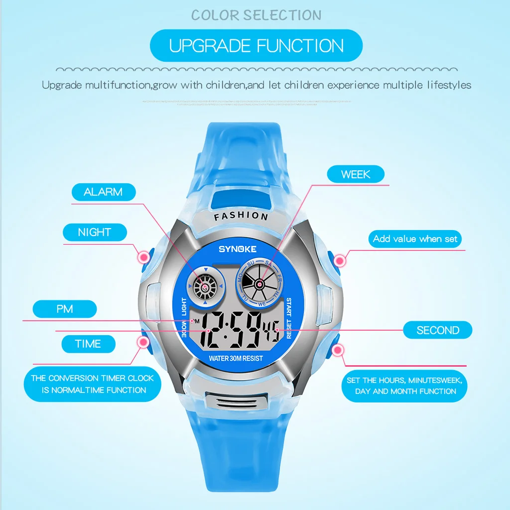 Цветные детские часы SYNOKE, водонепроницаемые цифровые многофункци...