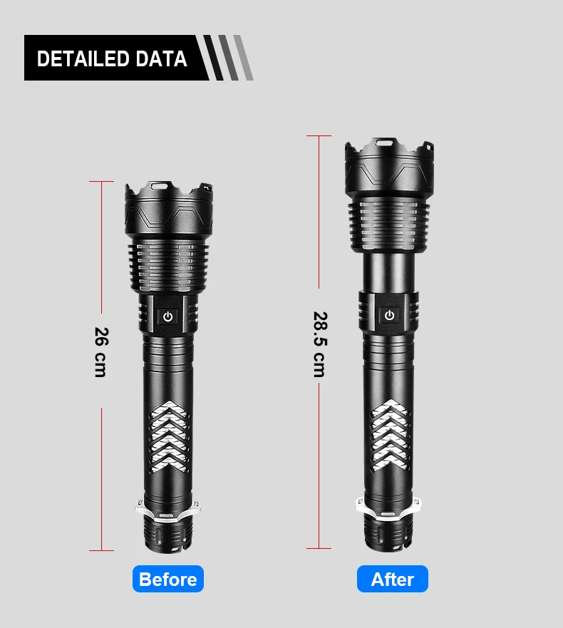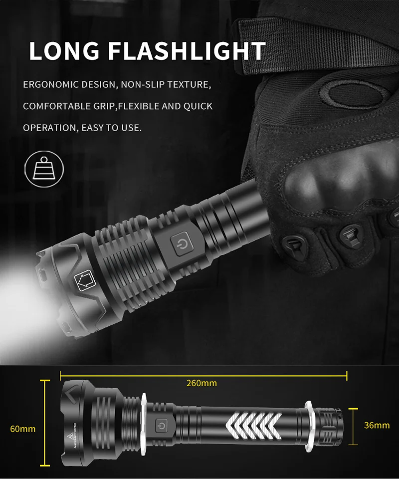 • Модель: XHP199 светодиодный фонарик• Фитиль Модель: 16-core светодиодный• Материал линз: оптическая выпуклая линза• Размер: 26 см * 6 см * 36 см• Материал: алюминиевый сплав• Рабочее напряжение: 3,7 V• Цвет: черный• Режим фокусировки: Телескопический фокус• Вес нетто: 510 г (без аккумулятора)• Диапазон облучения: 800-1500 м• Класс водонепроницаемости: IPX6 (водонепроницаемый, непромокаемый)• Применимый аккумулятор: 26650/18650 батареи (требуется заказ)• Зарядка: TYPE-C прямого заряда USB (с выходом и двойным входом)• Положение шестерни: 5 передач (сильный, средний, слабый, быстрый мигание, медленное мигание)• Время работы: 2 аккумулятора 18650 4-8 часов; 2 аккумулятора 26650: 6-12 часовДисплей питания: переключатель имеет функцию отображения мощности. Зеленый светильник указывает на то, что батареи достаточно, а красный светильник указывает на то, что батареи недостаточно и их необходимо заряжать.