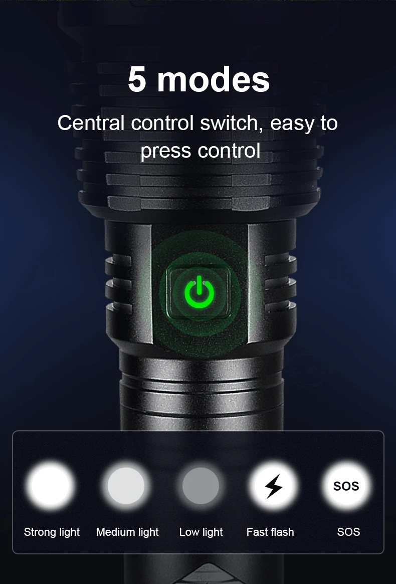 Switching mode5 modes (Strong light-weak light-flash-burst flash-SOS)
