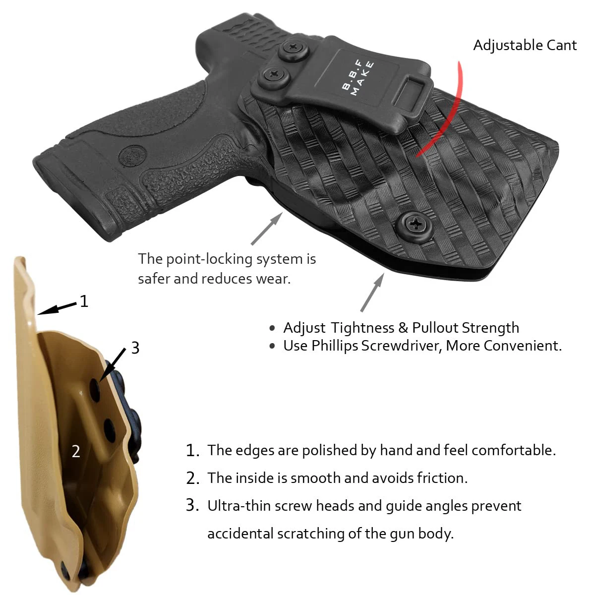 Наш щит Smith & Wesson M & P 2,0 9 мм 40 S & W кобура IWB имеет звуковую систему блокировки Posi-Click, И пистолет имеет четкий звук «щелчок», когда он вставлен, так что вы знаете, что ваш пистолет плотно сидит. Поскольку время реакции имеет критическое значение для выживания, мы используем установочный винт для регулировки герметичности для определения силы, необходимой для извлечения. Нейлон + ремень из стекловолокна крепкие и надежные зажимы, вы можете отрегулировать угол от 0 до 15 градусов в соответствии с вашими привычками, чтобы вы могли достичь самой быстрой скорости.
