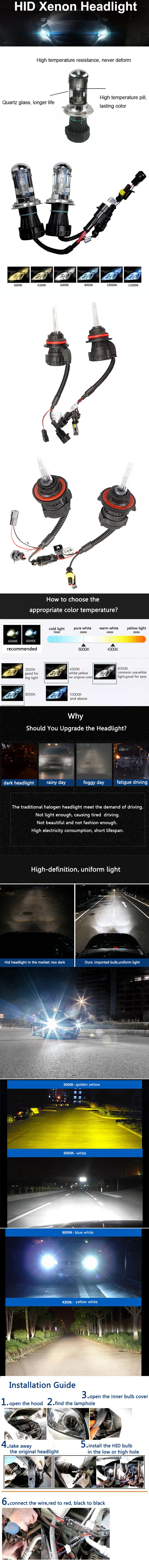 Характеристика:1. Срок службы: более 3000 часов2. Низкое энергопотребление3. Чистая кварцевая лампа с защитой от ультрафиолета4. Процент дефектов менее 0.1%5. Тип лампы:Одна лампа: H1 H3 H4-1 H7 H8/H9/H11 9004/9007-1 9005/HB3/H109006/HB4 H13-1 880/881/H27Ксенон и галогенная Высокая Низкая лампа: H4-2 H13-2 9004/9007-2Высокая Низкая Биксеноновая лампа: H4-3 H13-3 9004/9007-36. Цветовая температура:4300k-желтый белый 6000k-холодный белый8000k-синий белый 10000k-голубой 12000k-синийТемно-синий или другой цвет, пожалуйста, свяжитесь со мной, спасибо.PS: высокая температура цвета не означает более яркий, это означает, что цвет отличается.Все детали для вашей справки, мы отправим вам то, что вы выбрали, спасибо.