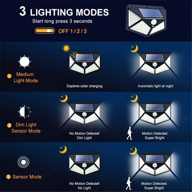 Уличный настенный светильник на солнечной батарее, 100 светодиосветодиодный, 72 COB, с пассивным ИК датчиком движения