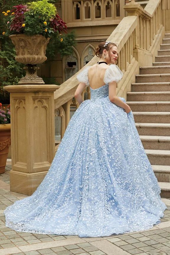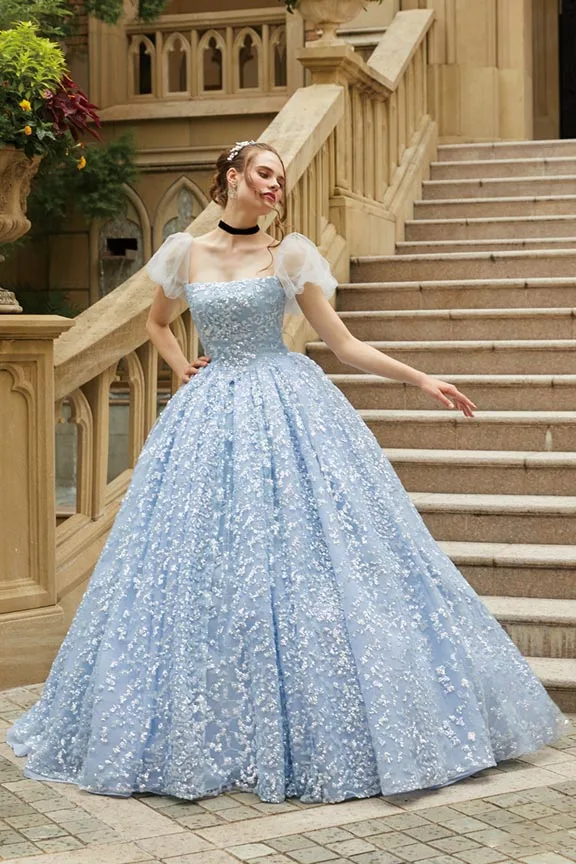 Платье принцессы с квадратным вырезом и коротким рукавом для выпускного вечера бальные платья с блестками детское синее вечернее Тюлевое платье со шлейфом Свадебное платье с открытой спиной