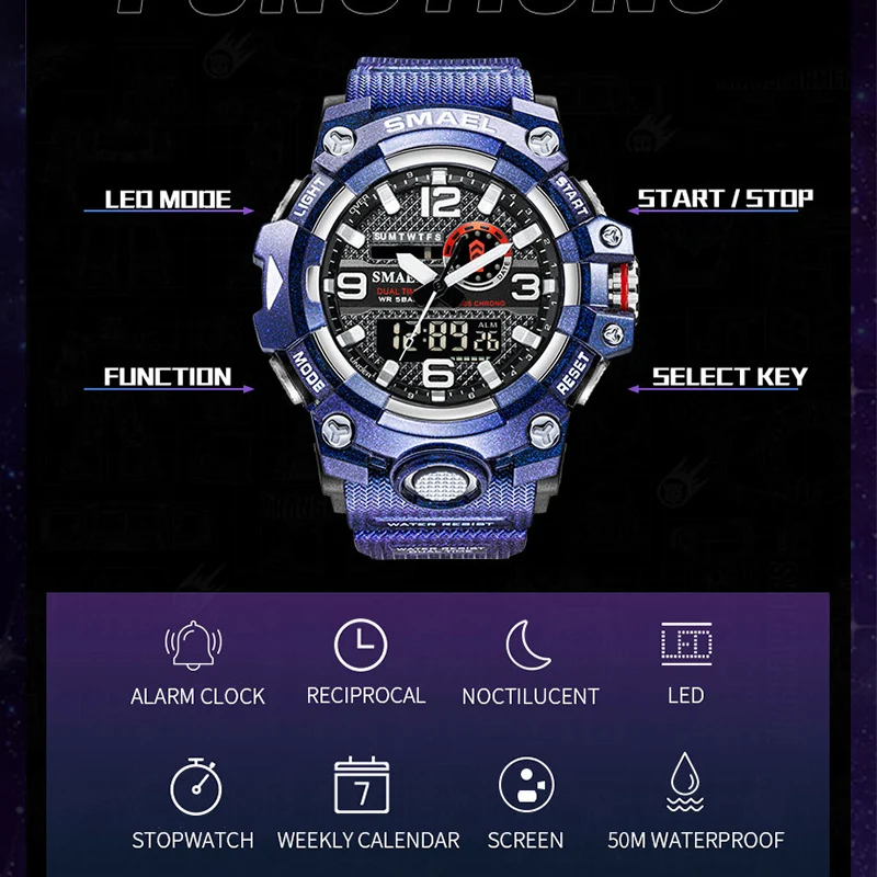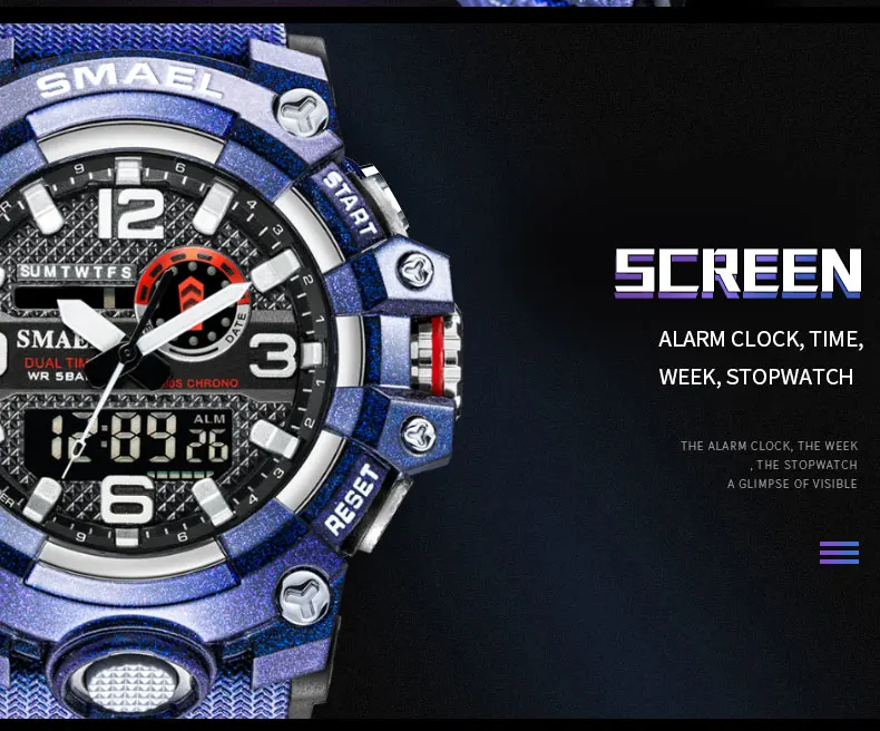 Часы SMAEL Мужские кварцевые в стиле милитари, Модные фиолетовые водонепроницаемые спортивные с двойным дисплеем, 8035