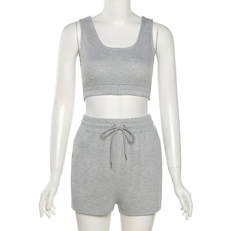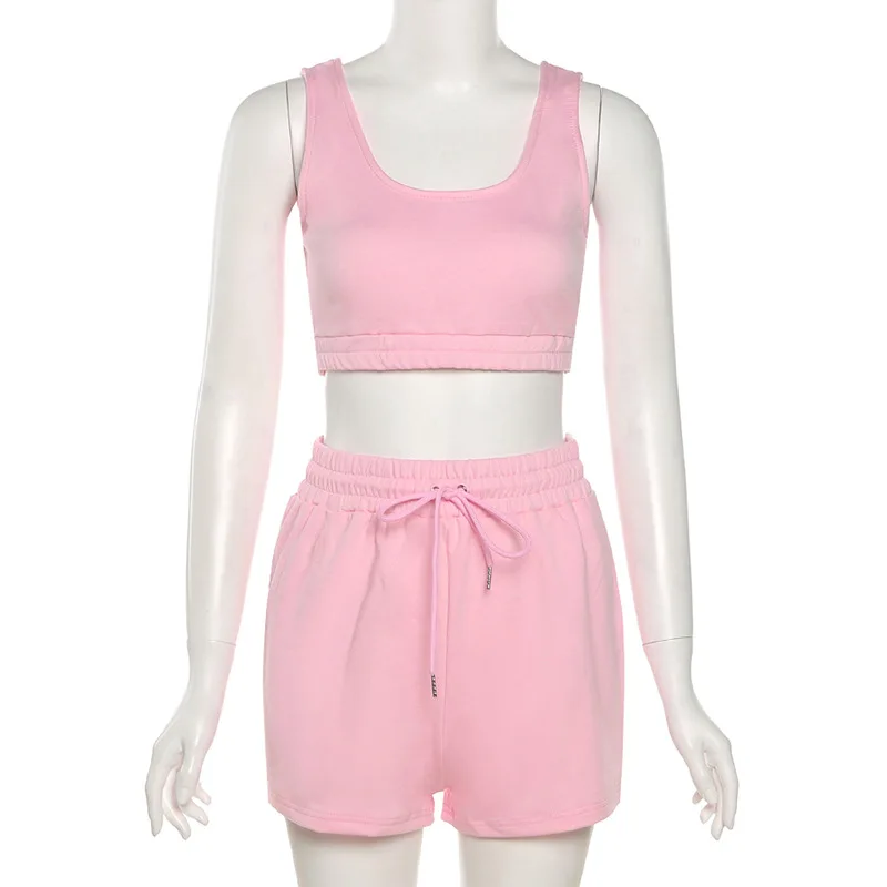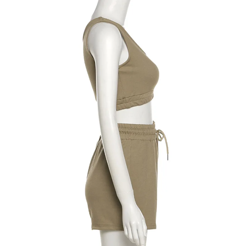 Женский Повседневный однотонный спортивный костюм, комплект из двух предметов, укороченный топ и шорты на шнуровке, летний спортивный костюм для отдыха, 2022