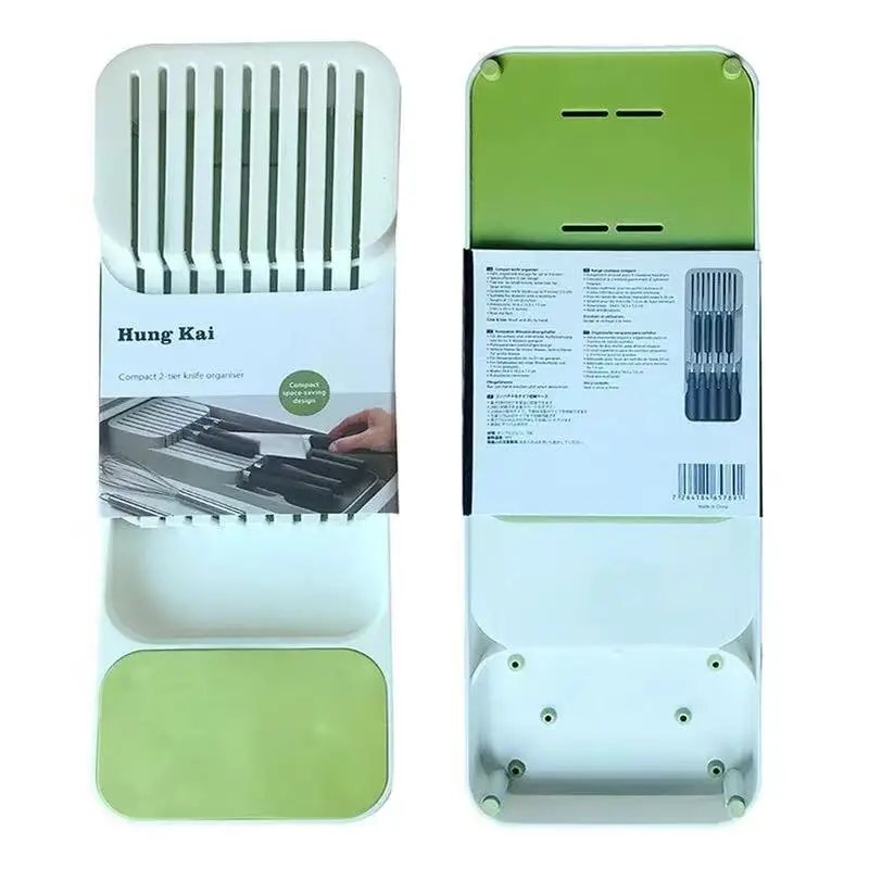 Двухслойное хранилище, может вместить несколько ножей, многоразовые ножи для хранения, ножи большого размера для хранения нижнего уровня могут вместить длинные резцы 23 см с противоскользящим основанием.