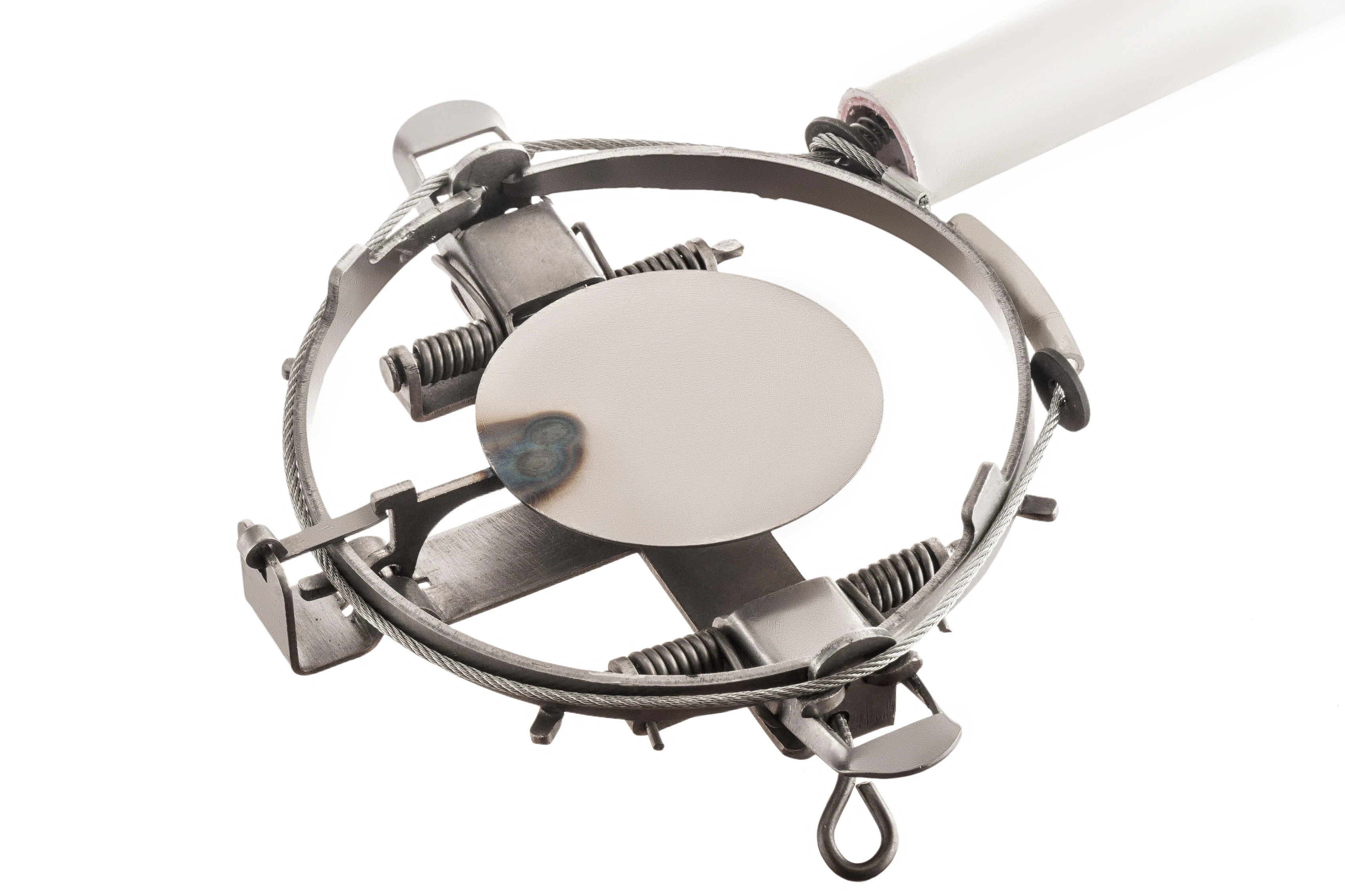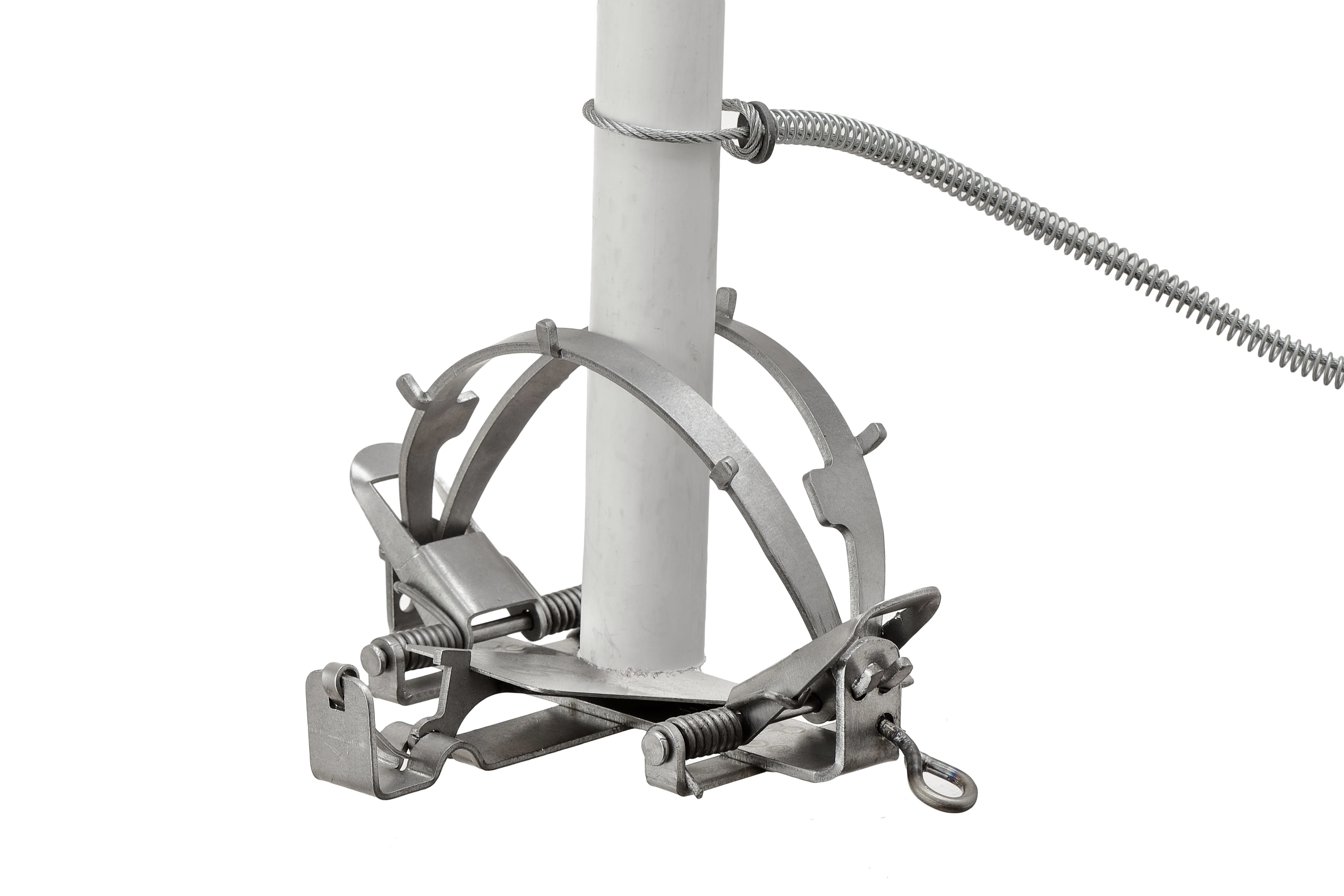 1. В маленькую петлю с силиконовой трубкой вставить палку или прилагаемую к капкану трубку и, удерживая трубу ногами на земле, затянуть пружину вместе с шайбой вверх. Образуется большая петля.