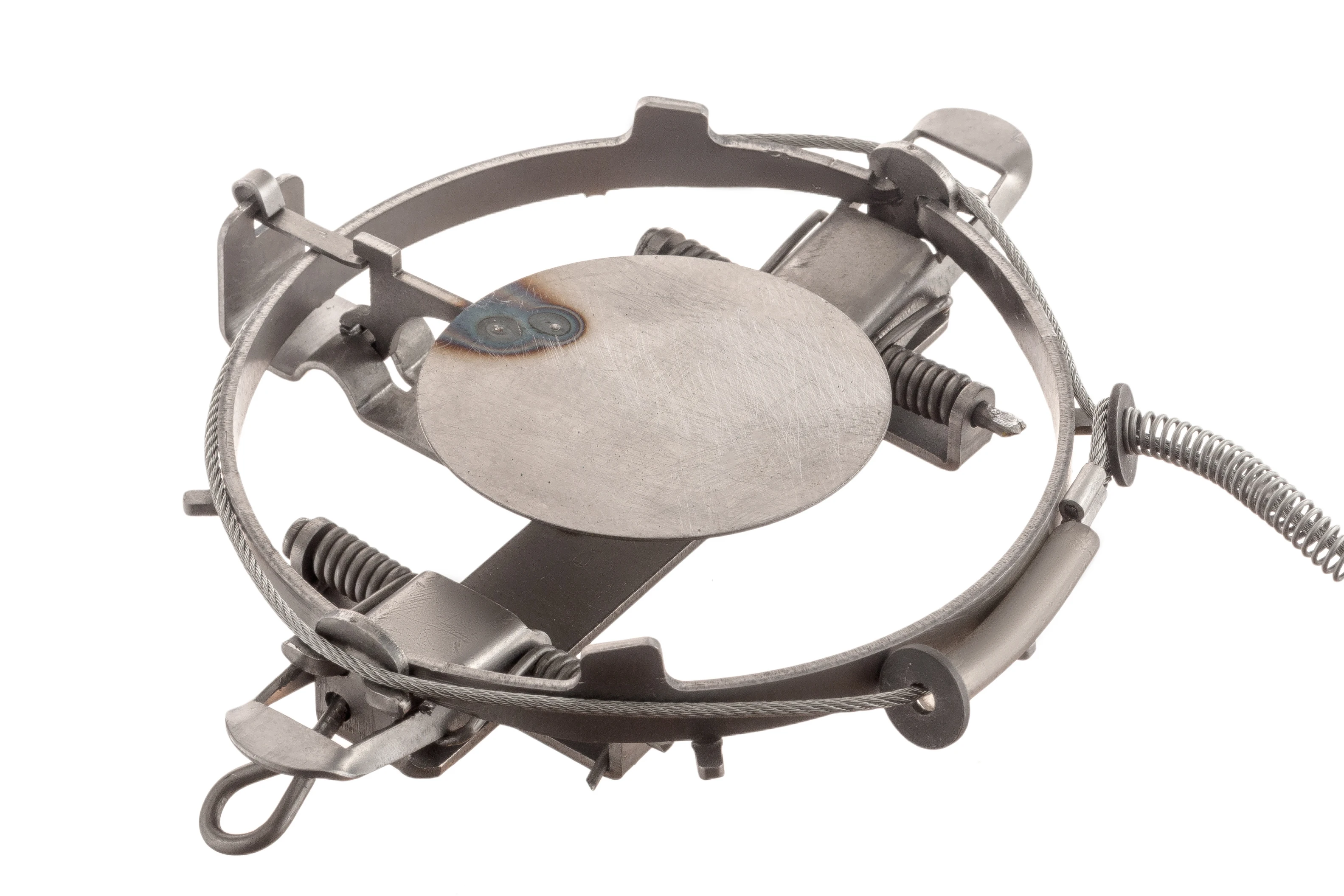 Изготовлен на базе капкана "Тайга-М" №4. Оснащён тросом (d3 мм), образующим петлю, и пружиной, которые вместе образуют удерживающий механизм ловушки.