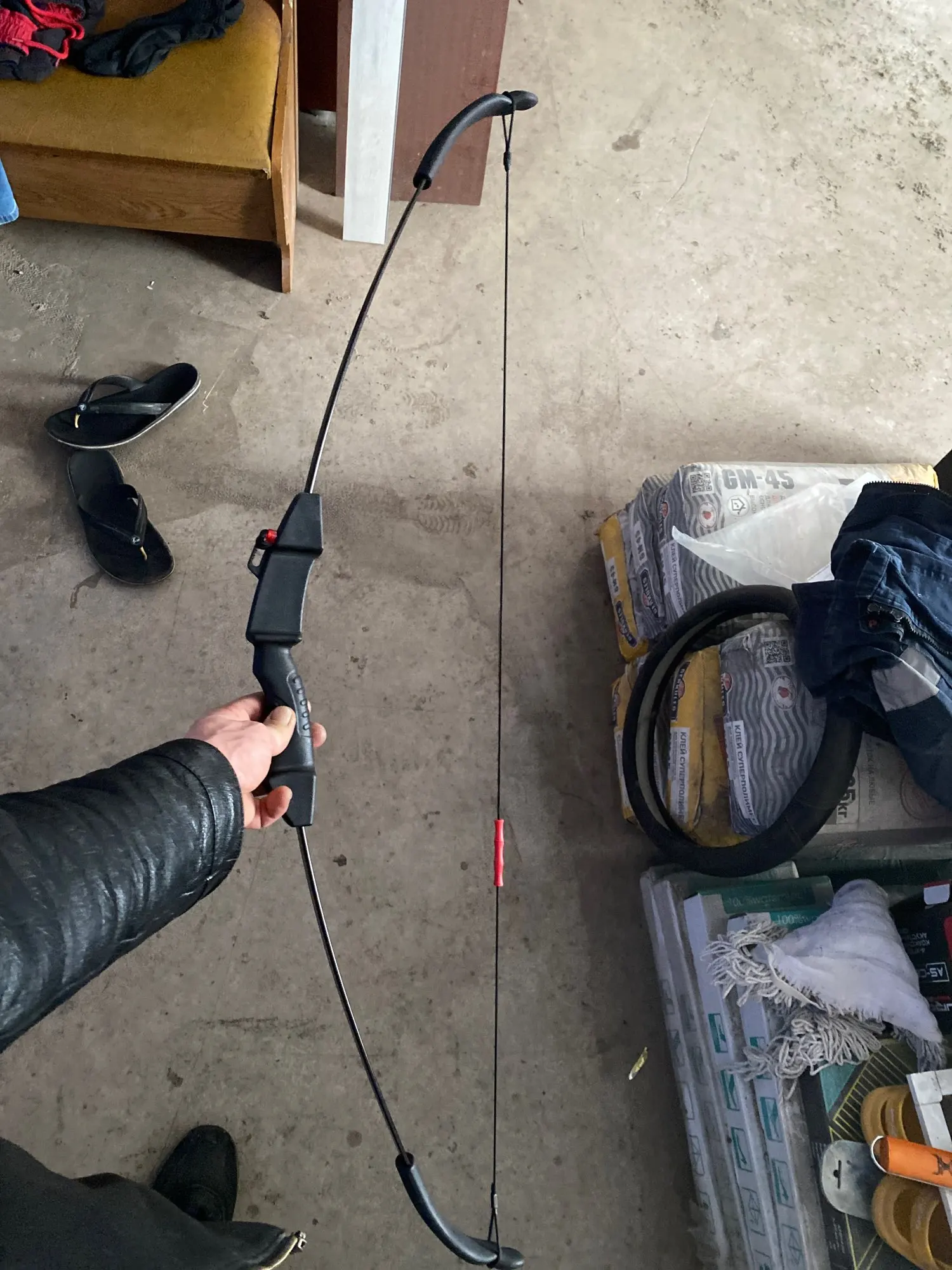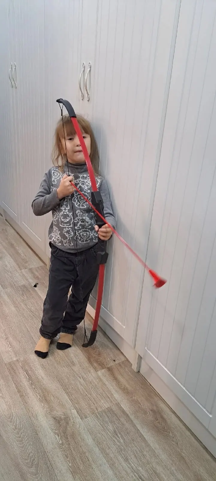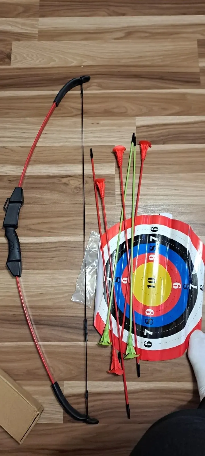получили лук, он конечно слабенький, но ребенок довольный, уже стреляет
