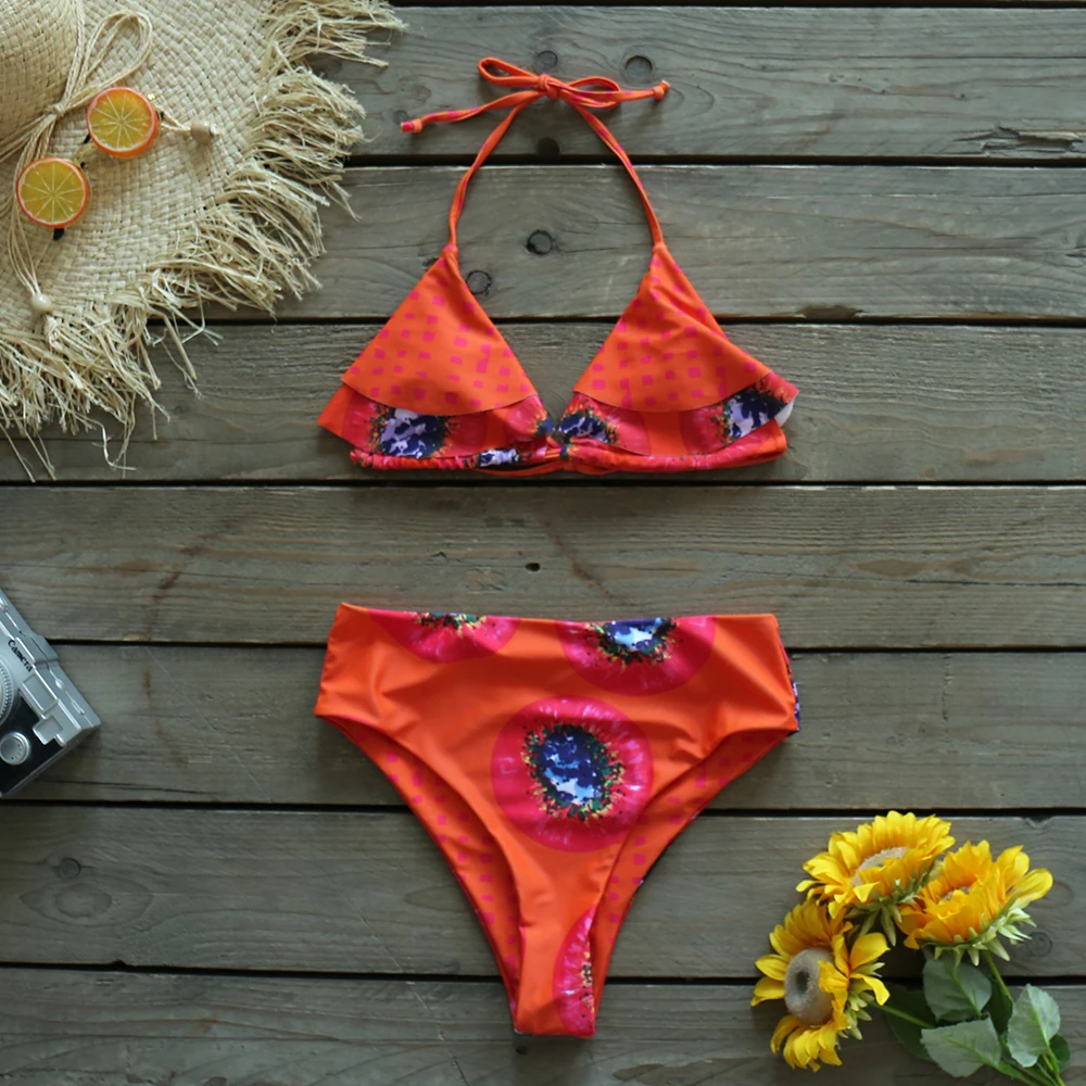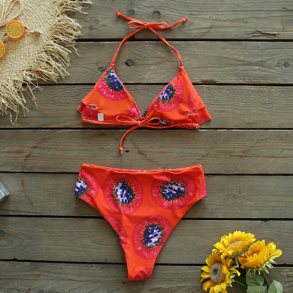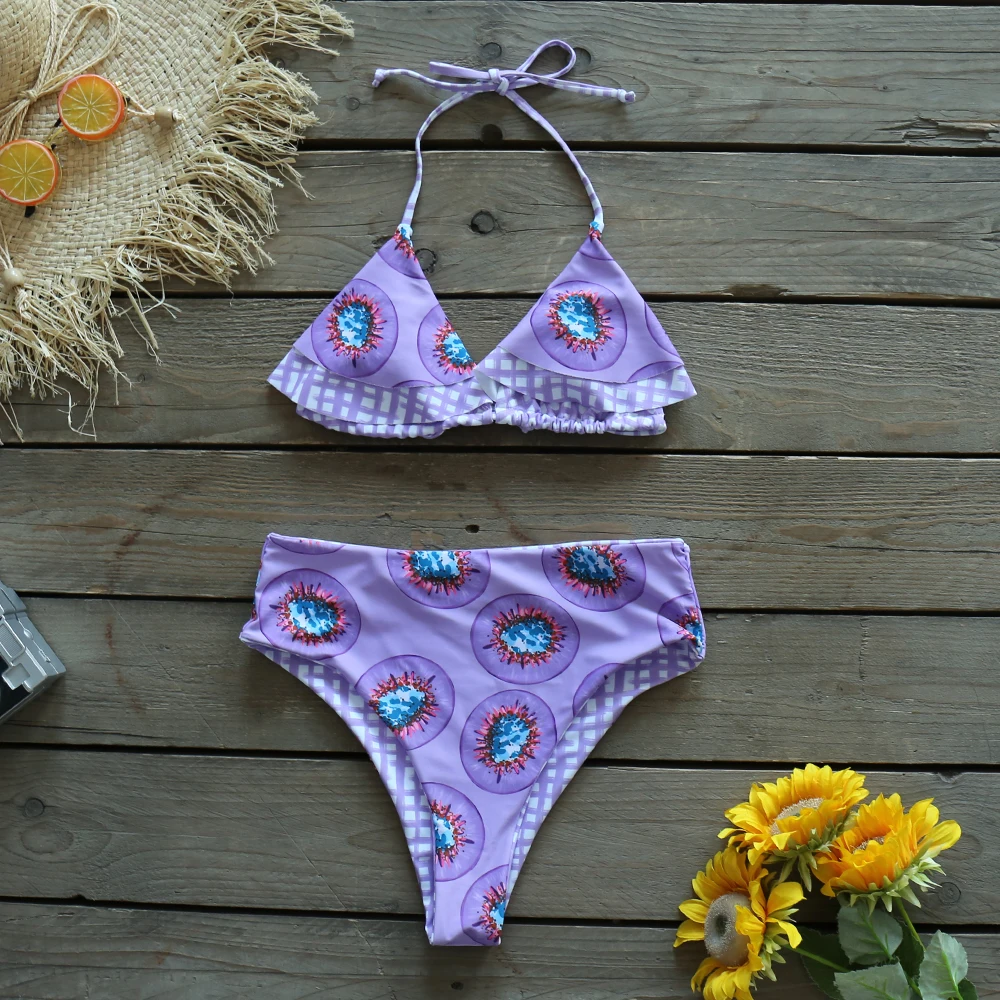 Сексуальные бикини, женский купальник 2022, купальник с принтом, пляжная одежда с высокой талией, купальный костюм, женское бикини с двойными оборками