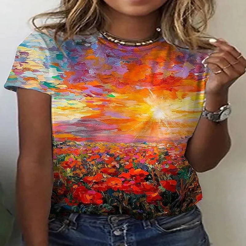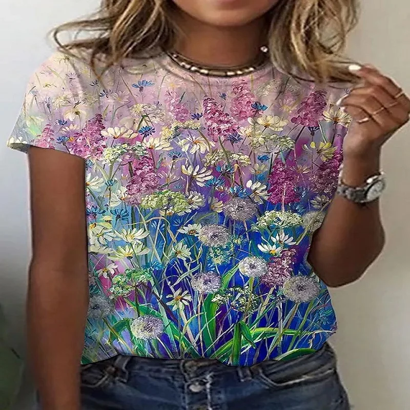 Новая стильная женская рубашка с коротким рукавом и цветочным принтом, уличная одежда, Женская тканевая блузка с круглым вырезом, футболка большого размера, женская одежда