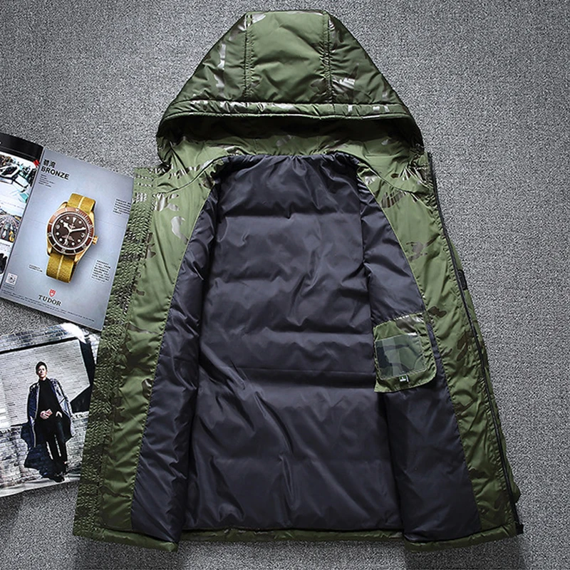 Мужская куртка на утином пуху, теплая ветровка, с капюшоном, камуфл...