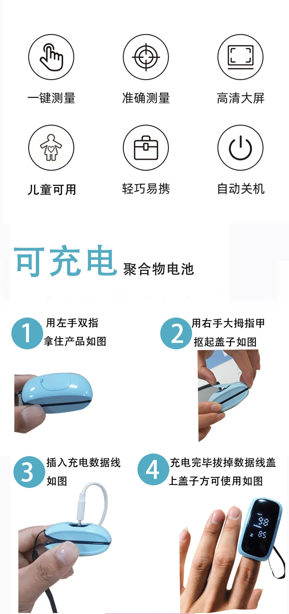 Термометр очень точный и маленький, Пульсоксиметр перезаряжается с помощью зарядного устройства для мобильного телефона, который я люблю, батарея работает хорошо
