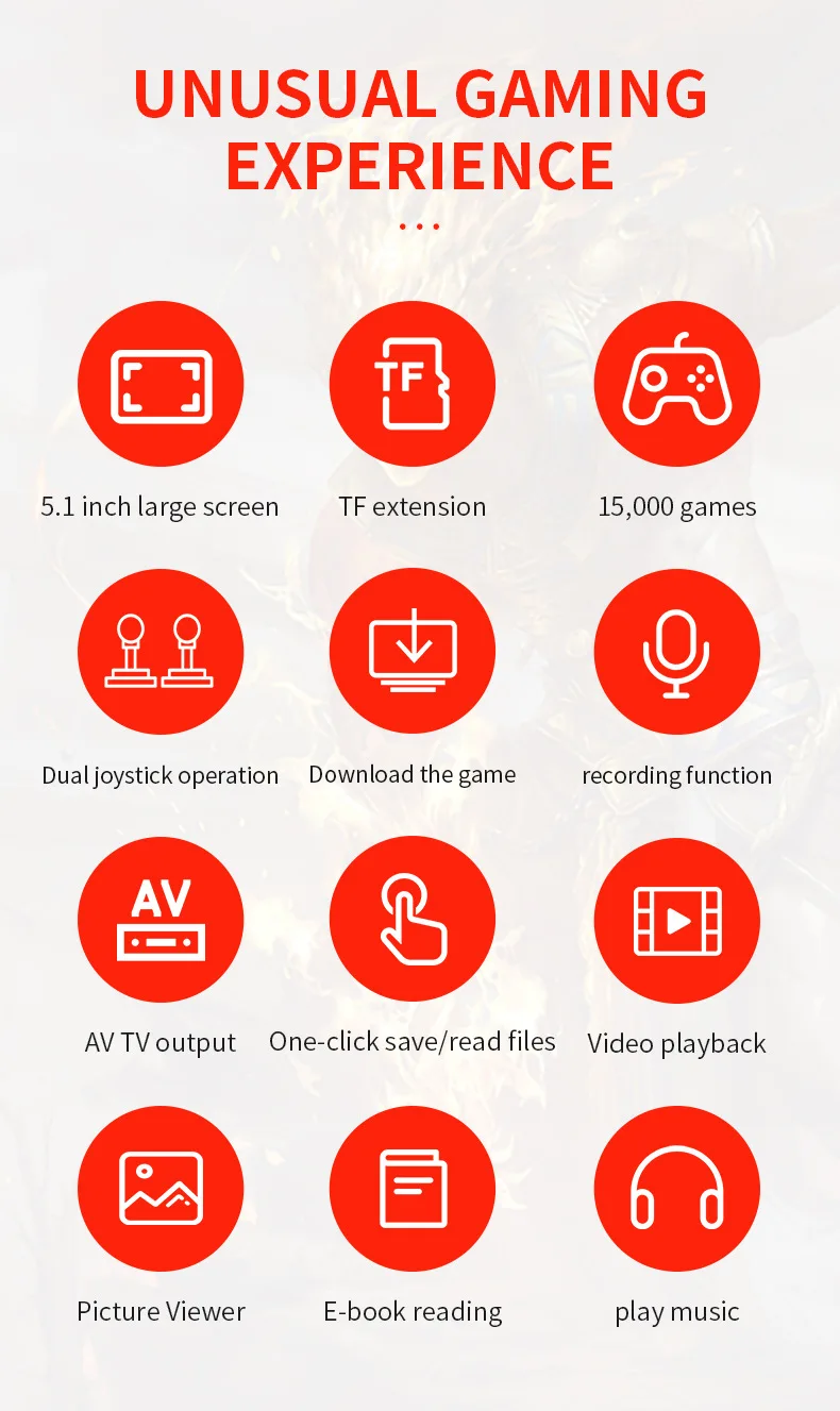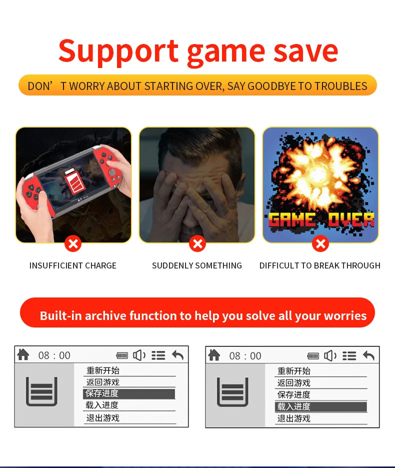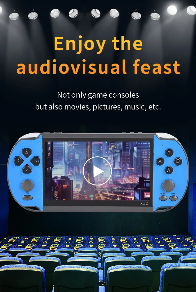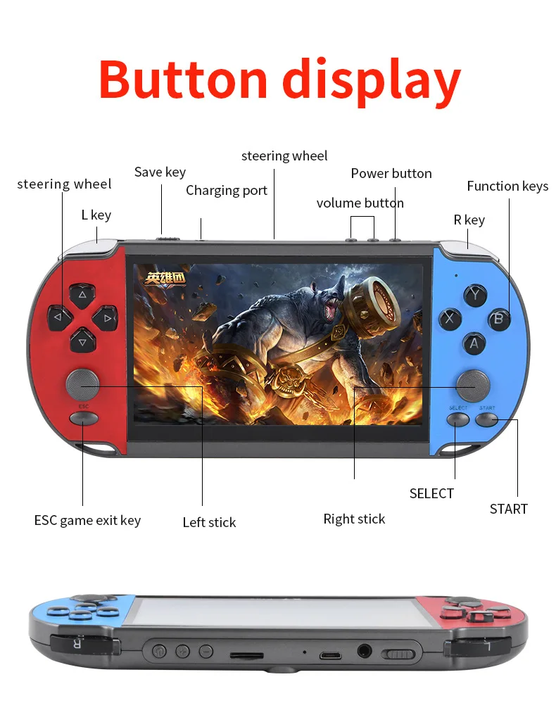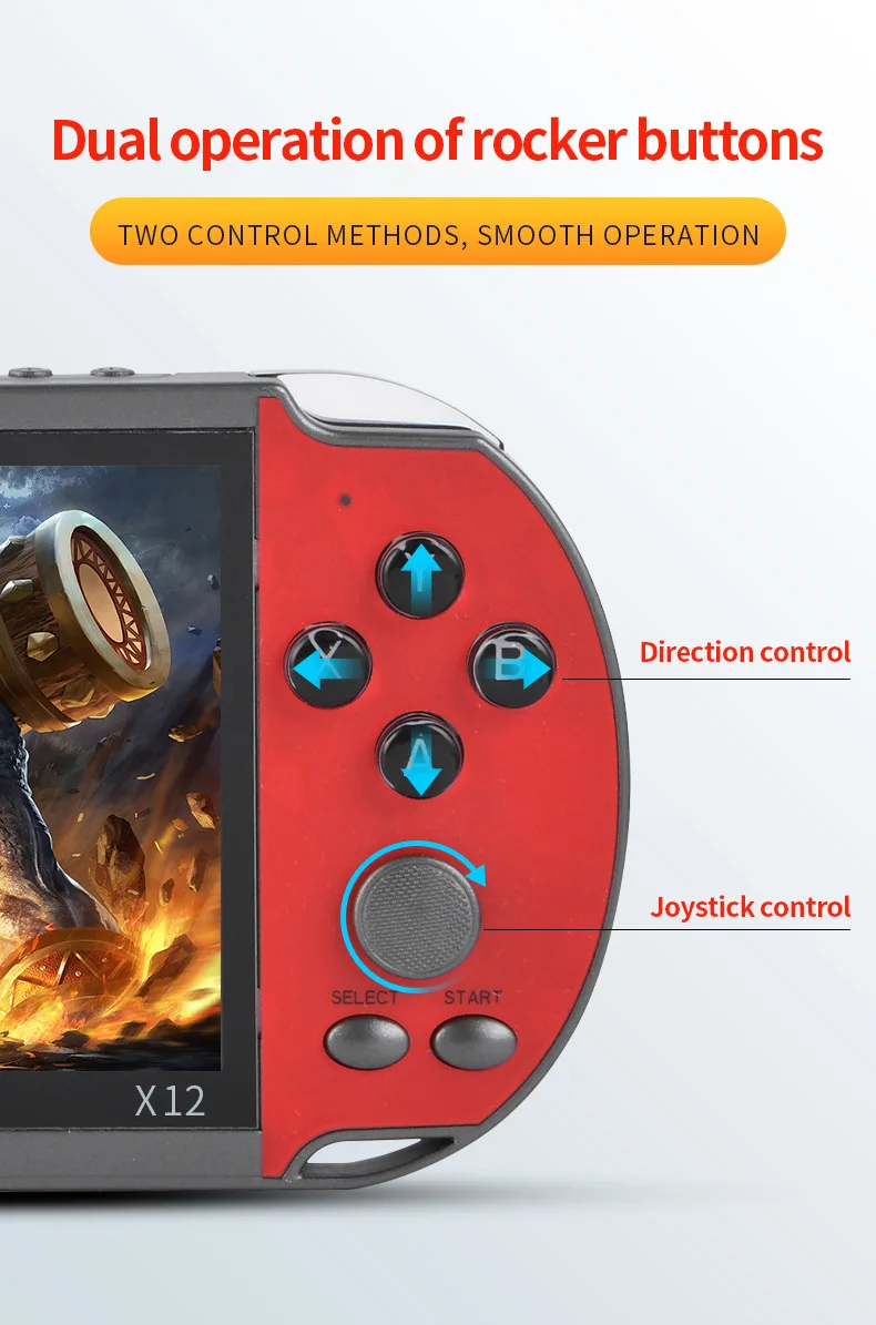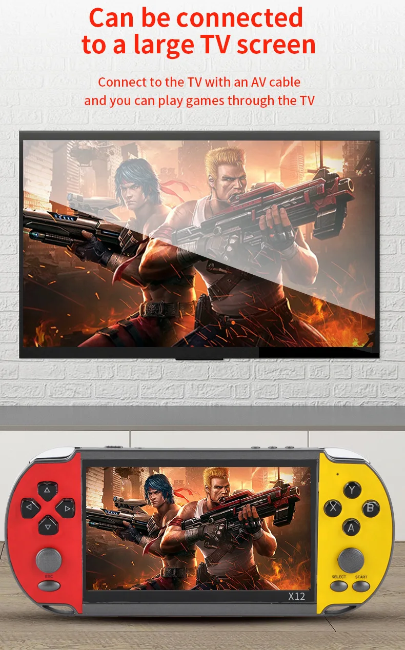 Характеристики:Артикул: X12Цвет: красный/красный и желтый/красный и синий/синийДисплей: 5,1-дюймовый IPS большой Экран (480*270 Разрешение)Игры: Встроенный 3200 + игрыПоддержка GB/ GBA/ GBC/ SEGA/ CPS/ NEOGEO/ MAME/ FC/ SFCПоддержка загрузки 8 бит/16 бит/32 бит игрПоддержка мгновенного архиваROM: 8 ГбTf-карта: Поддержка 1-32 ГбТВ-видео: поддержка av-кабеляMuliti-Language s: Поддержка 28 языков на операции, игровой язык на английском языкеАккумулятор: 2500 мАчСрок службы батареи: 4 часаЗарядка: 2 часаСохранение игры: ПоддержкаВидео: поддержка RMVB/ MP4/ 3GP/ AVIМузыка: поддержка MP3/ WMAWAVЭлектронные книги: ПоддержкаКамара: ПоддержкаПоддержка 3,5 мм стерео наушникиУпаковка: 0,45 кг/22*13*7 смПосылка включает в себя:1 * цветная коробка1 * игровая консоль1 * зарядный кабель1 * av-кабель1 * наушники1 * Руководство пользователя