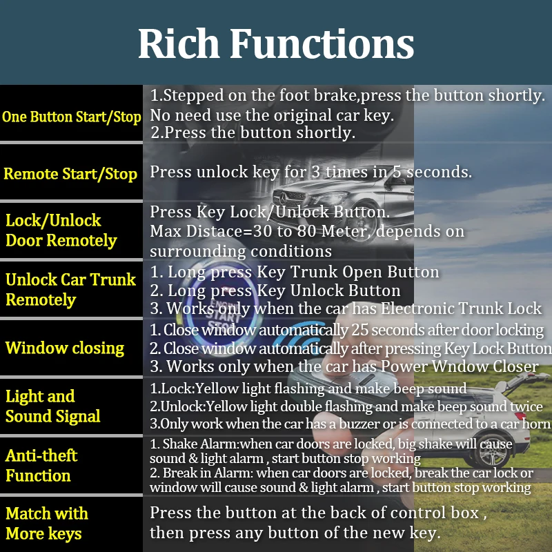 1. Не нажимайте на тормоз, короткое нажатие, чтобы открыть звука ACC, затем нажмите кнопку "ВКЛ" приборной панели, индикатор светильник вспышек, затем нажмите кнопку ВЫКЛ, вы можете цикличной работой.